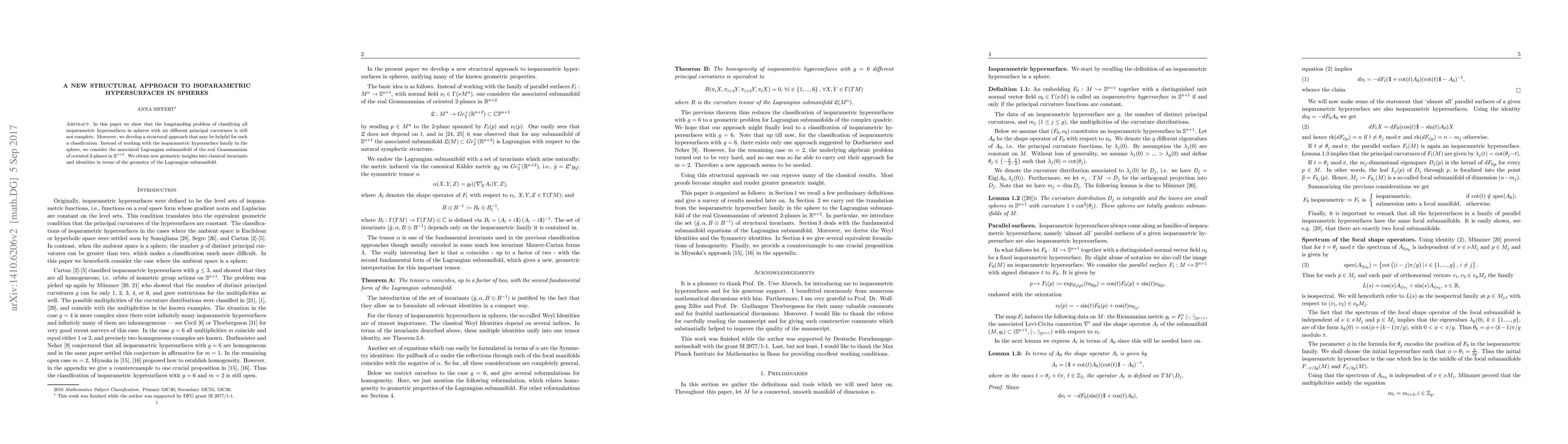 This paper proposes a new structural approach to classify isoparametric hypersurfaces in spheres with four or six distinct principal curvatures by studying their associated Lagrangian submanifolds in the real Grassmannian of oriented 2-planes in higher-dimensional Euclidean space, yielding novel geometric insights.