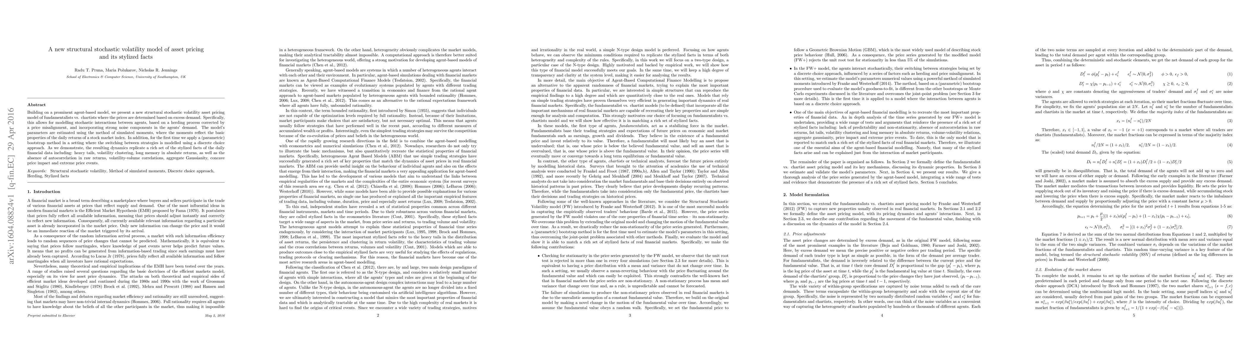 Building on a prominent agent-based model, we present a new structural stochastic volatility asset pricing model of fundamentalists vs. chartists where the prices are determined based on excess demand. Specifically, this allows for modelling stochastic interactions between agents, based on a herding process corrected by a price misalignment, and incorporating strong noise components in the agents' demand. The model's parameters are estimated using the method of simulated moments, where the moments reflect the basic properties of the daily returns of a stock market index. In addition, for the first time we apply a (parametric) bootstrap method in a setting where the switching between strategies is modelled using a discrete choice approach. As we demonstrate, the resulting dynamics replicate a rich set of the stylized facts of the daily financial data including: heavy tails, volatility clustering, long memory in absolute returns, as well as the absence of autocorrelation in raw returns, volatility-volume correlations, aggregate Gaussianity, concave price impact and extreme price events.