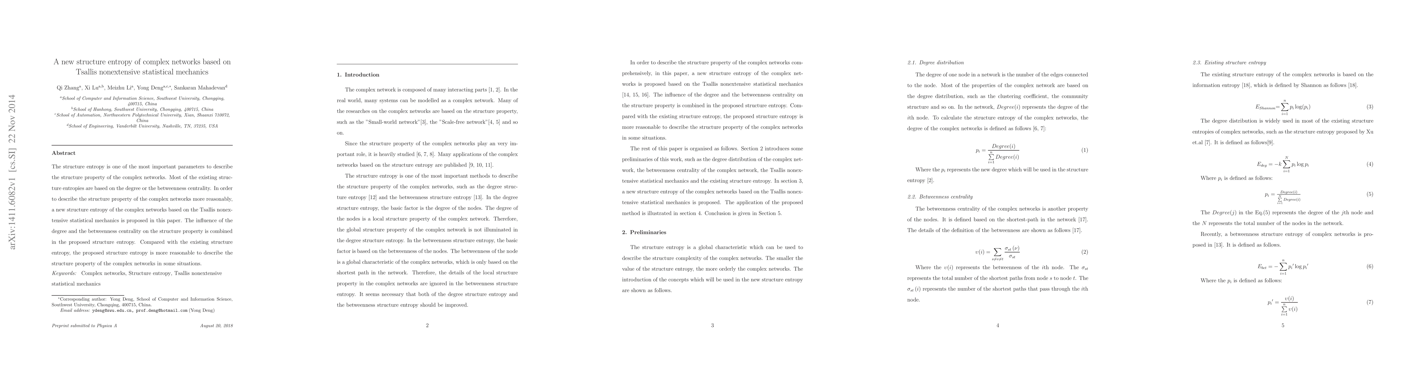 The paper proposes a new structure entropy for complex networks based on Tsallis nonextensive statistical mechanics, combining degree and betweenness centrality influences. This new measure is argued to more accurately describe the structure property of complex networks compared to existing methods.
