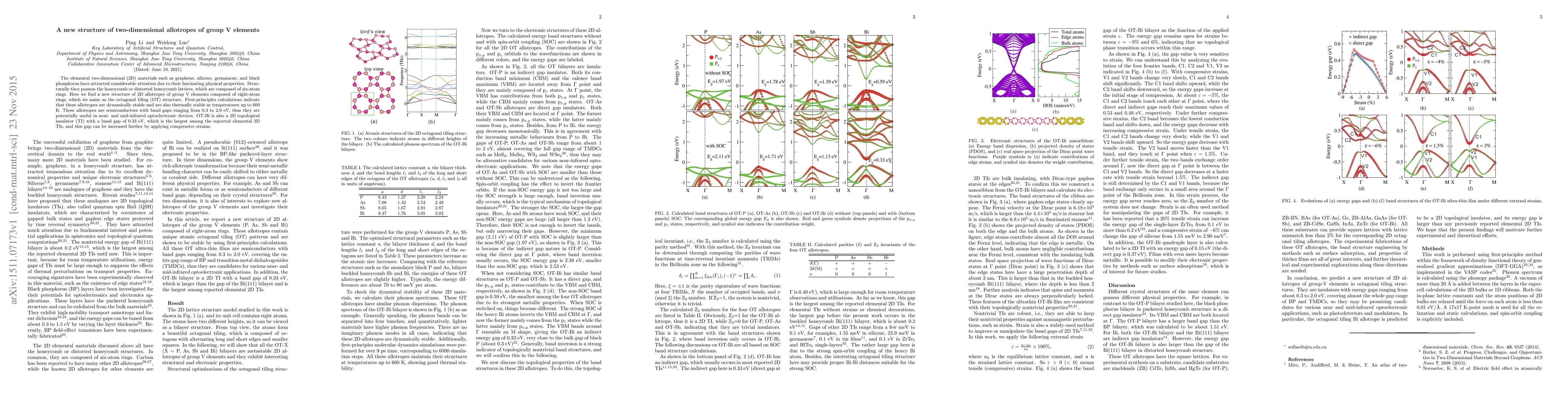 This paper introduces a new octagonal tiling (OT) structure of two-dimensional allotropes of group V elements, featuring eight-atom rings instead of the usual six-atom rings. These materials are dynamically and thermally stable, and exhibit semiconductor properties with band gaps suitable for optoelectronic devices. OT-Bi, in particular, is a 2D topological insulator with a large band gap that can be enhanced by compressive strain.