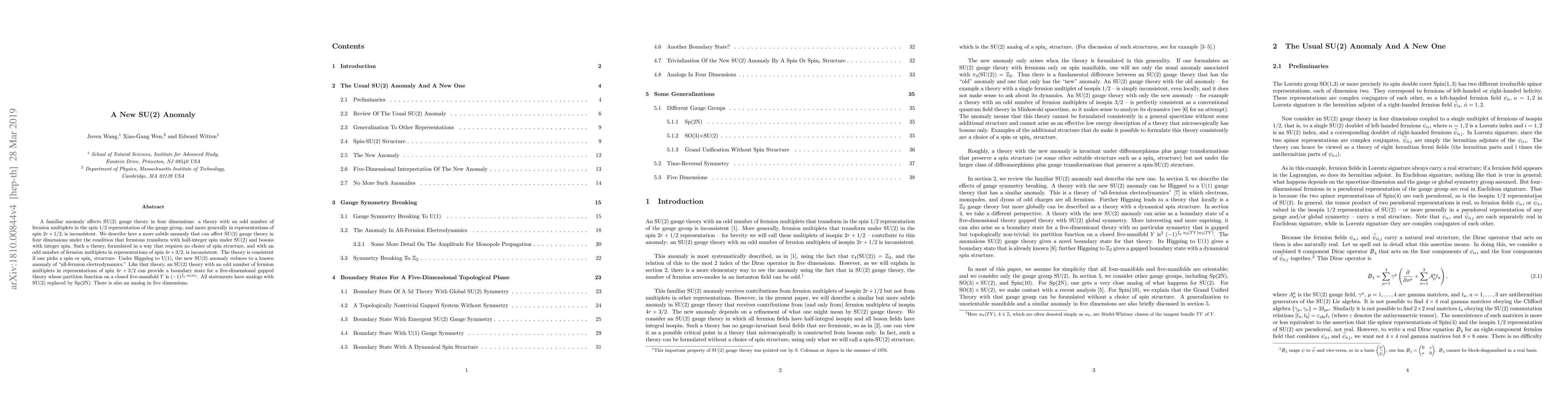 A familiar anomaly affects SU(2) gauge theory in four dimensions: a theory with an odd number of fermion multiplets in the spin 1/2 representation of the gauge group, and more generally in representations of spin 2r+1/2, is inconsistent. We describe here a more subtle anomaly that can affect SU(2) gauge theory in four dimensions under the condition that fermions transform with half-integer spin under SU(2) and bosons with integer spin. Such a theory, formulated in a way that requires no choice of spin structure, and with an odd number of fermion multiplets in representations of spin 4r+3/2, is inconsistent. The theory is consistent if one picks a spin or spin_c structure. Under Higgsing to U(1), the new SU(2) anomaly reduces to a known anomaly of "all-fermion electrodynamics." Like that theory, an SU(2) theory with an odd number of fermion multiplets in representations of spin 4r+3/2 can provide a boundary state for a five-dimensional gapped theory whose partition function on a closed five-manifold Y is $(-1)^{\int_Y w_2w_3}$. All statements have analogs with SU(2) replaced by Sp(2N). There is also an analog in five dimensions.