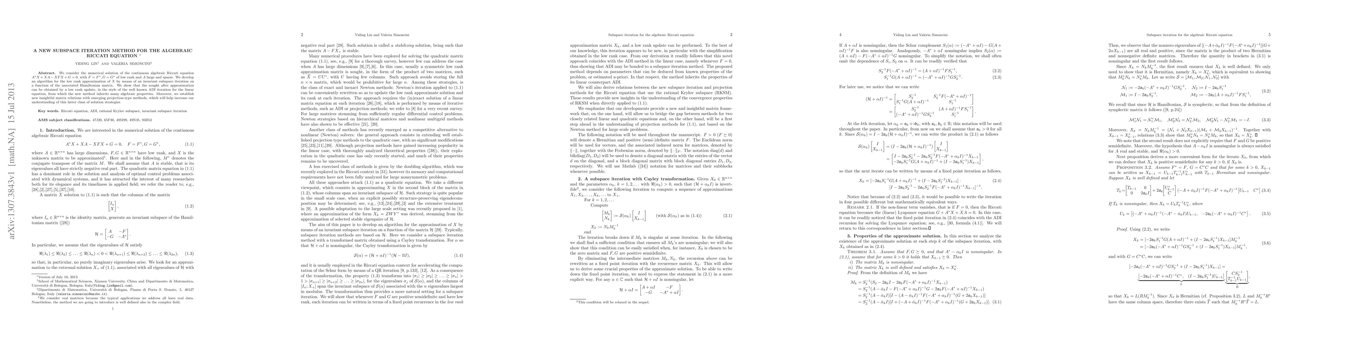We consider the numerical solution of the continuous algebraic Riccati equation $A^*X+XA-XFX+G=0$, with $F=F^*, G=G^*$ of low rank and $A$ large and sparse. We develop an algorithm for the low rank approximation of $X$ by means of an invariant subspace iteration on a function of the associated Hamiltonian matrix. We show that the sought after approximation can be obtained by a low rank update, in the style of the well known ADI iteration for the linear equation, from which the new method inherits many algebraic properties. Moreover, we establish new insightful matrix relations with emerging projection-type methods, which will help increase our understanding of this latter class of solution strategies.