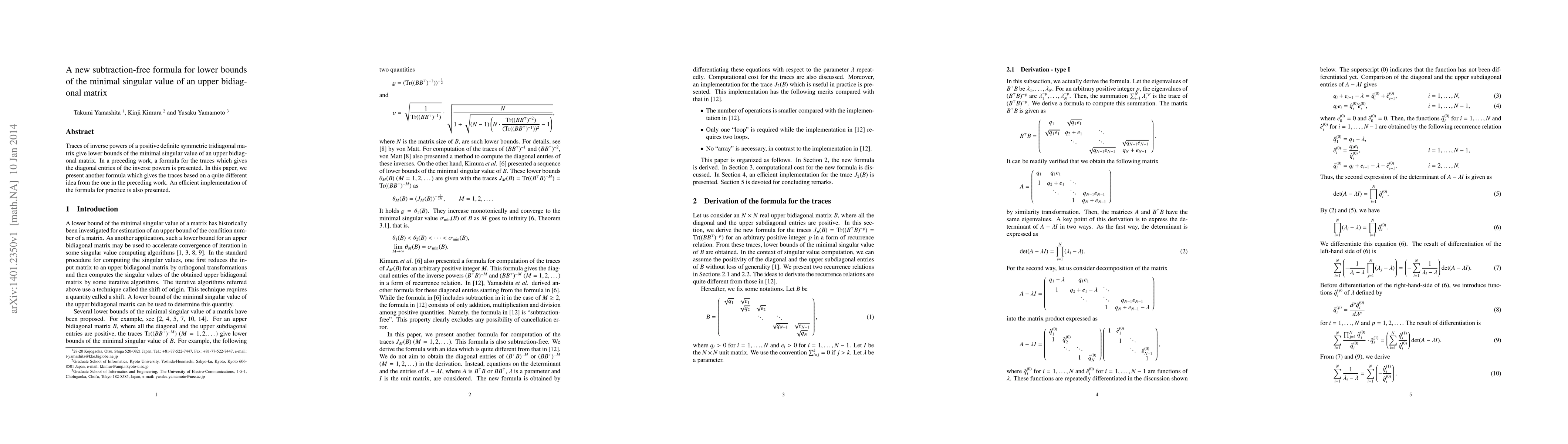 Traces of inverse powers of a positive definite symmetric tridiagonal matrix give lower bounds of the minimal singular value of an upper bidiagonal matrix. In a preceding work, a formula for the traces which gives the diagonal entries of the inverse powers is presented. In this paper, we present another formula which gives the traces based on a quite different idea from the one in the preceding work. An efficient implementation of the formula for practice is also presented.