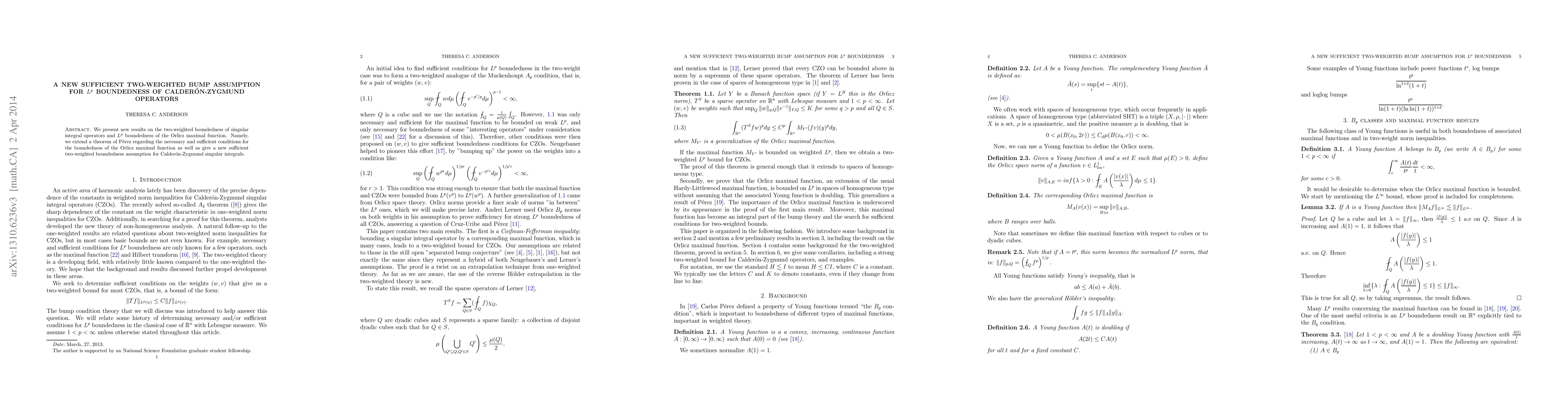This paper introduces a new sufficient two-weighted assumption for the $L^p$ boundedness of Calderón-Zygmund operators and extends Pérez's theorem on the necessary and sufficient conditions for the boundedness of the Orlicz maximal function.