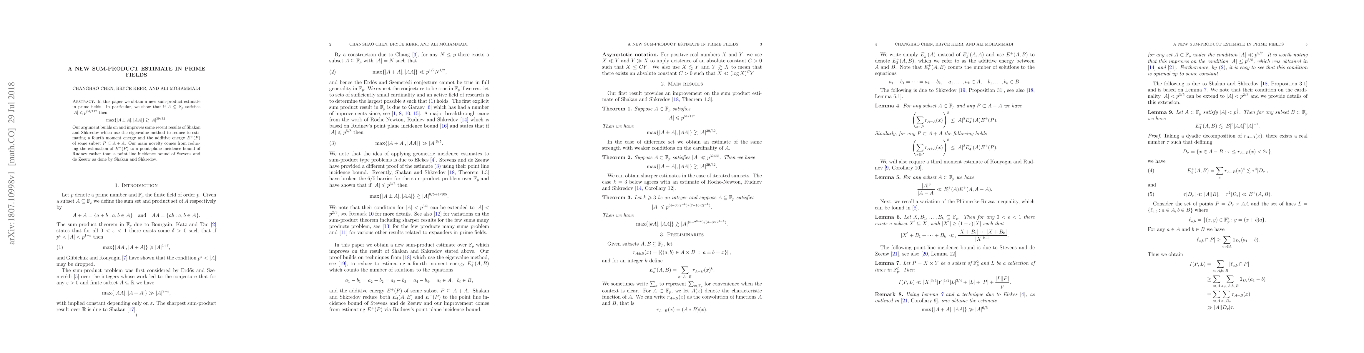 This paper presents a new sum-product estimate in prime fields, showing that for sets $A\subseteq \mathbb{F}_p$ with $|A|\le p^{64/117}$, $\max\{|A\pm A|, |AA|\} \gtrsim |A|^{39/32}$. The authors improve upon previous results by employing Rudnev's point-plane incidence bound instead of the traditional point-line incidence bound.