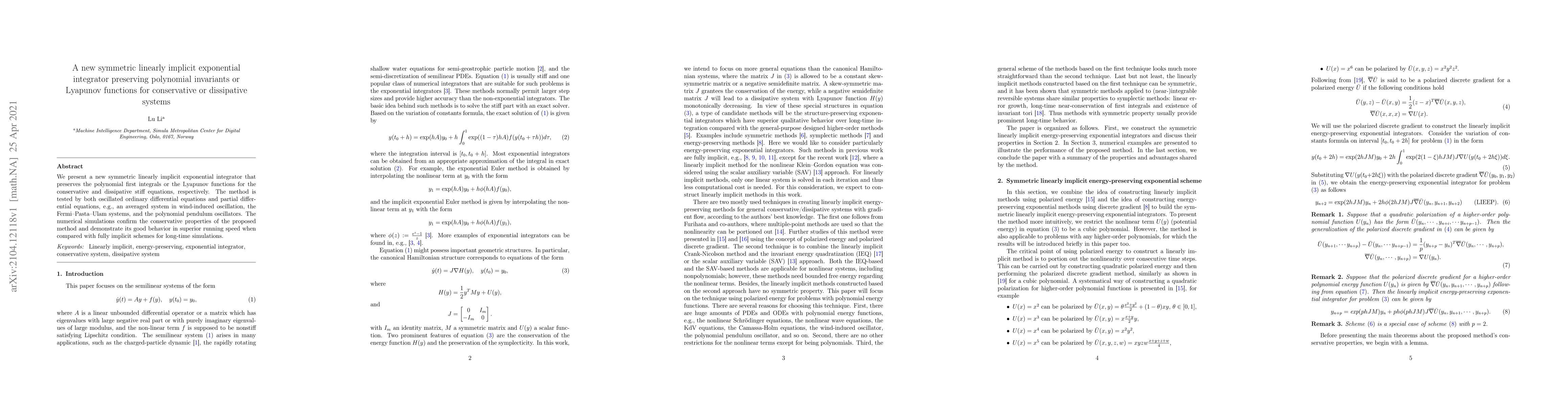 This paper introduces a new symmetric linearly implicit exponential integrator that maintains polynomial invariants or Lyapunov functions for conservative and dissipative systems. The method shows superior performance in long-time simulations, demonstrating both conservative properties and faster running speeds compared to fully implicit schemes.