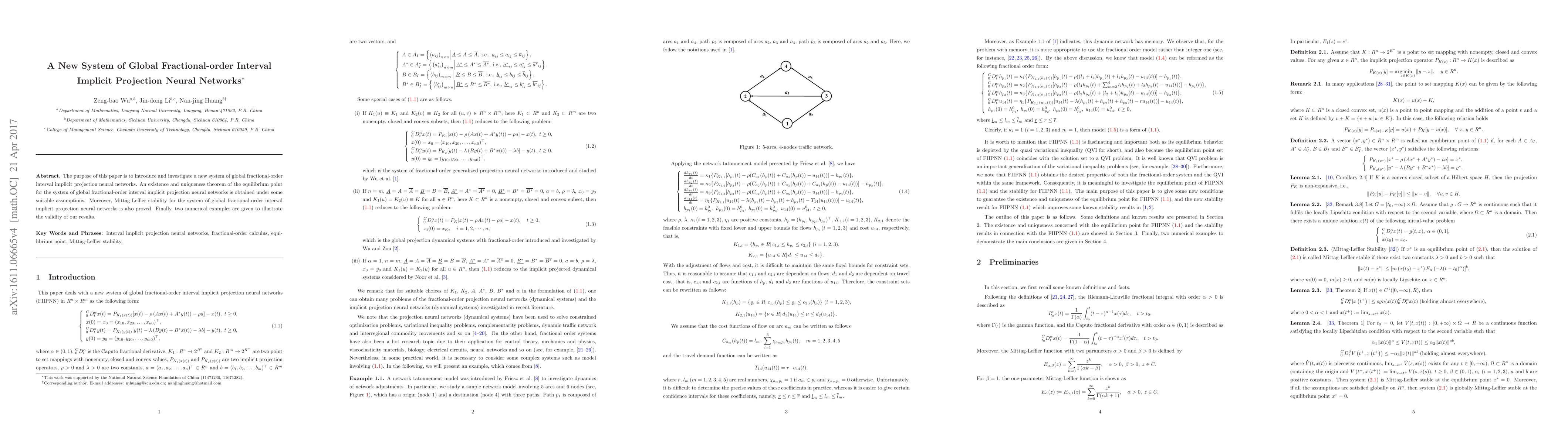 This paper introduces a new system of global fractional-order interval implicit projection neural networks, proving the existence and uniqueness of its equilibrium point and establishing its Mittag-Leffler stability. Two numerical examples are provided to demonstrate the practical applicability of the proposed system.