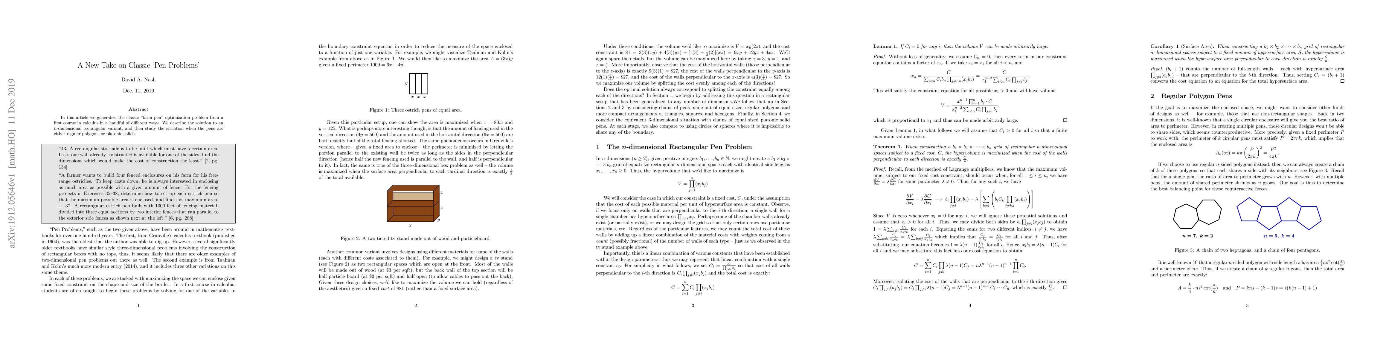 This paper generalizes the classic "farm pen" optimization problem by exploring an $n$-dimensional rectangular variant and analyzing configurations where pens take the form of regular polygons or platonic solids. The solutions offer new insights into geometric optimization beyond traditional calculus approaches.