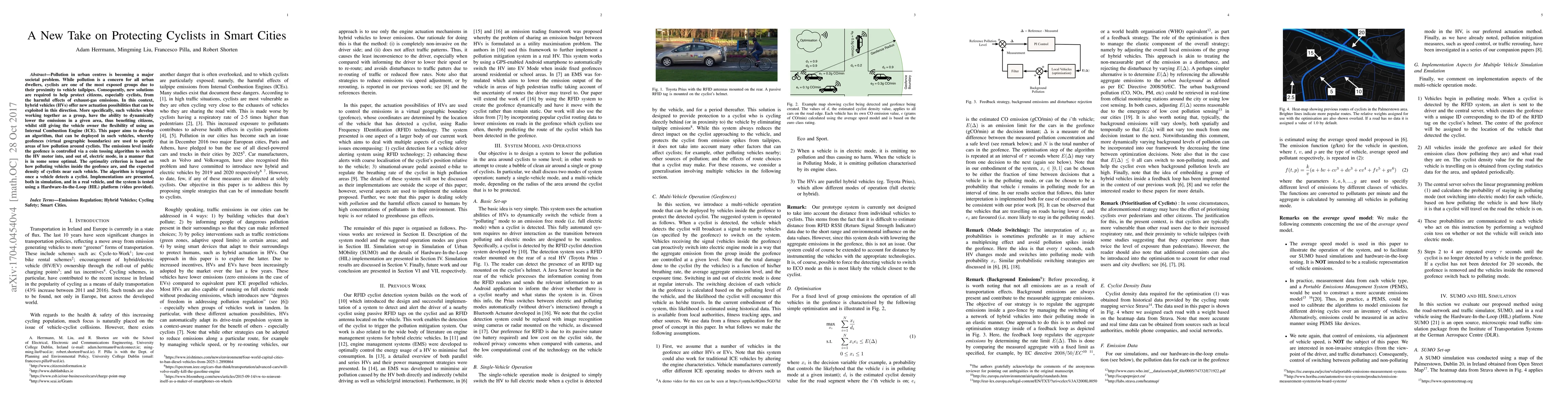 Pollution in urban centres is becoming a major societal problem. While pollution is a concern for all urban dwellers, cyclists are one of the most exposed groups due to their proximity to vehicle tailpipes. Consequently, new solutions are required to help protect citizens, especially cyclists, from the harmful effects of exhaust-gas emissions. In this context, hybrid vehicles (HVs) offer new actuation possibilities that can be exploited in this direction. More specifically, such vehicles when working together as a group, have the ability to dynamically lower the emissions in a given area, thus benefiting citizens, whilst still giving the vehicle owner the flexibility of using an Internal Combustion Engine (ICE). This paper aims to develop an algorithm, that can be deployed in such vehicles, whereby geofences (virtual geographic boundaries) are used to specify areas of low pollution around cyclists. The emissions level inside the geofence is controlled via a coin tossing algorithm to switch the HV motor into, and out of, electric mode, in a manner that is in some sense optimal. The optimality criterion is based on how polluting vehicles inside the geofence are, and the expected density of cyclists near each vehicle. The algorithm is triggered once a vehicle detects a cyclist. Implementations are presented, both in simulation, and in a real vehicle, and the system is tested using a Hardware-In-the-Loop (HIL) platform (video provided).