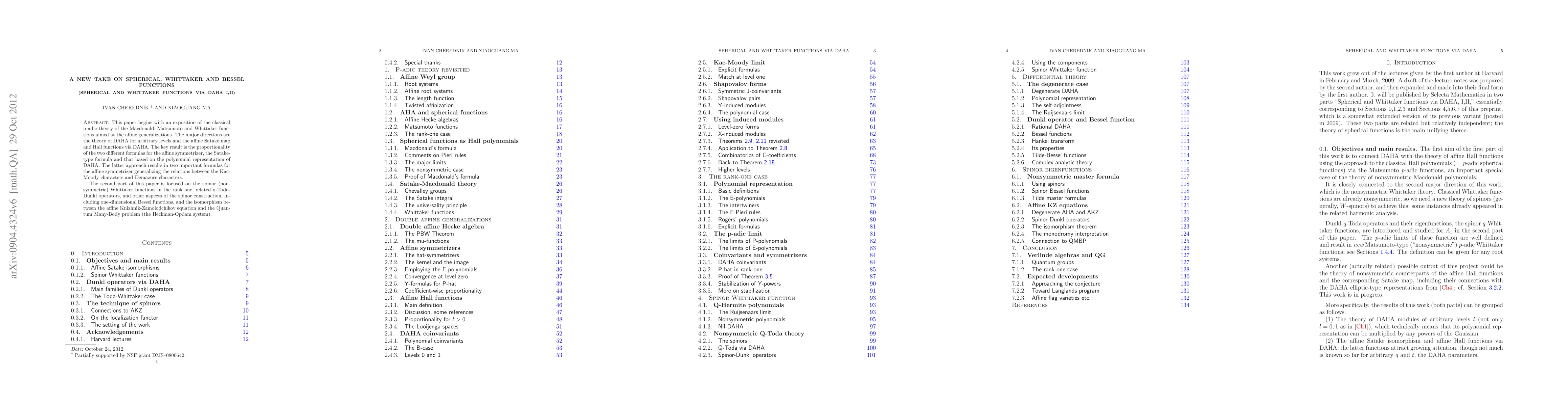 This paper is based on the lectures given by the first author at Harvard in February and March, 2009. It begins with an introduction to the classical p-adic theory of the Macdonald, Matsumoto and Whittaker functions. Its major directions are as follows: 1) extending the theory of DAHA to arbitrary levels; 2) the affine Satake isomorphism and Hall functions via DAHA; 3) the spinor Dunkl operators for the Q-Toda equation; 4) applications to the nil-DAHA and q-Whittaker functions; 5) the technique of spinors in the differential theory and its applications to the AKZ-QMBP isomorphism theorem.