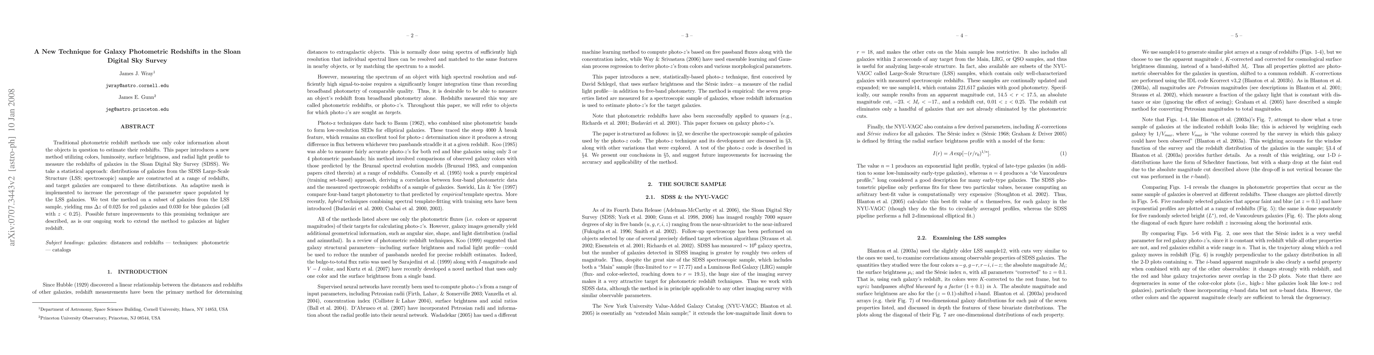 This paper introduces a novel technique for galaxy photometric redshifts using the Sloan Digital Sky Survey, incorporating colors, luminosity, surface brightness, and radial light profiles. The method statistically compares target galaxies to distributions from the SDSS Large-Scale Structure sample, achieving an rms Delta-z of 0.025 for red galaxies and 0.030 for blue galaxies (z < 0.25).