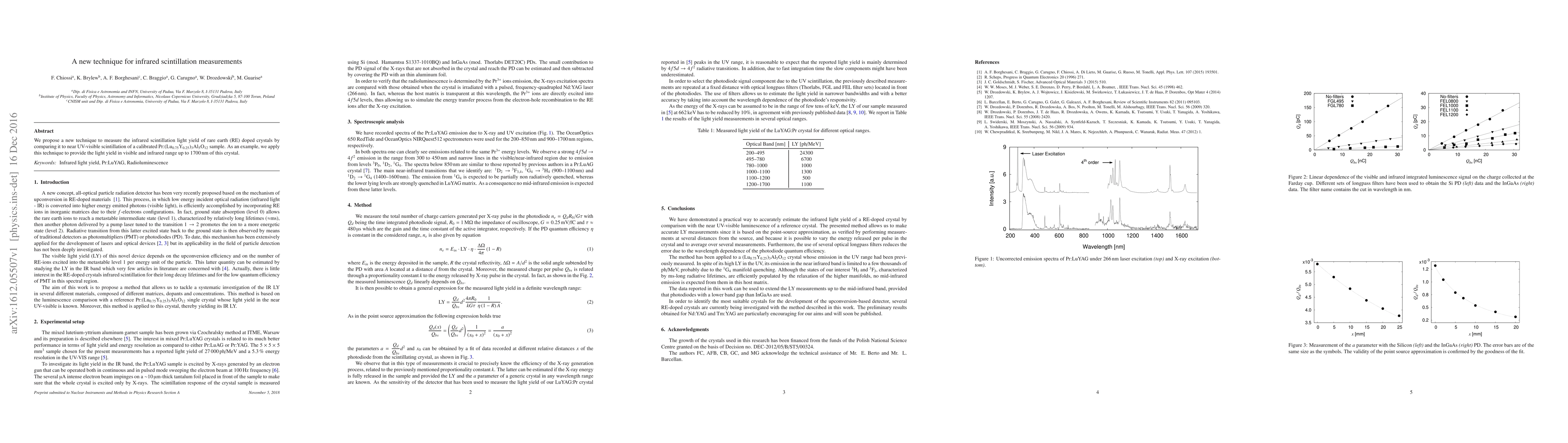 We propose a new technique to measure the infrared scintillation light yield of rare earth (RE) doped crystals by comparing it to near UV-visible scintillation of a calibrated Pr:(Lu$_{0.75}$Y$_{0.25}$)$_{3}$Al$_5$O$_{12}$ sample. As an example, we apply this technique to provide the light yield in visible and infrared range up to \SI{1700}{nm} of this crystal.
