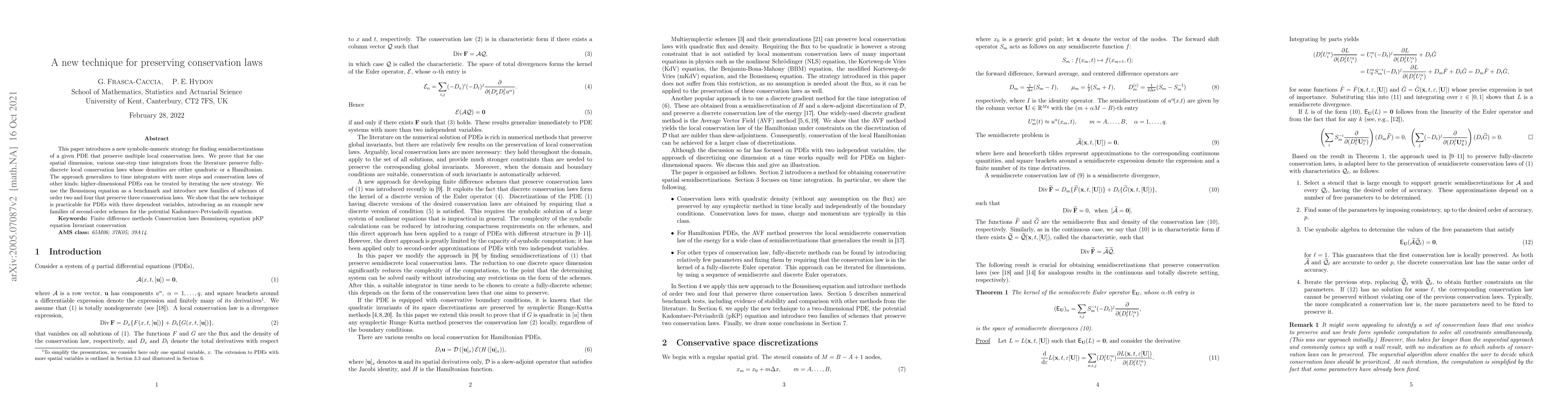 This paper introduces a new technique for preserving conservation laws in partial differential equations (PDEs), which generalizes to higher dimensions and various types of conservation laws, and has practical applications for PDEs with multiple dependent variables.