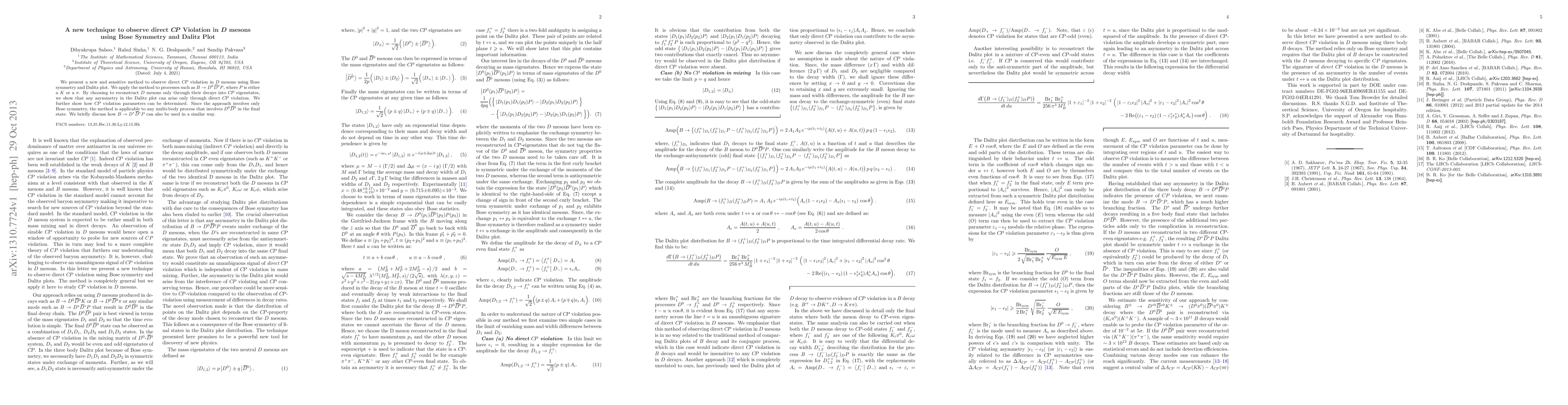 This paper introduces a novel technique to detect direct CP violation in $D$ mesons via Bose symmetry and Dalitz plot analysis, specifically in processes like $B \to D^0\bar{D}^0 P$. The method isolates CP eigenstates in $D$ meson decays, enabling direct CP violation observation and parameter determination.