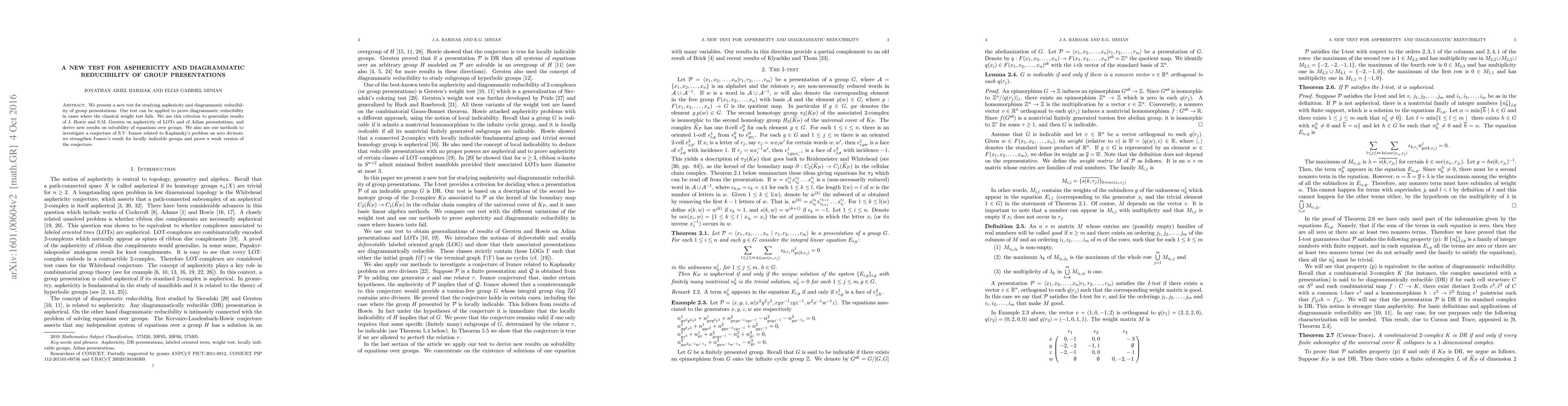 This paper introduces a novel test for determining the asphericity and diagrammatic reducibility of group presentations, extending classical methods where they fail. The test is applied to generalize existing results and derive new insights into solvability of group equations and a strengthened conjecture regarding zero divisors in locally indicable groups.