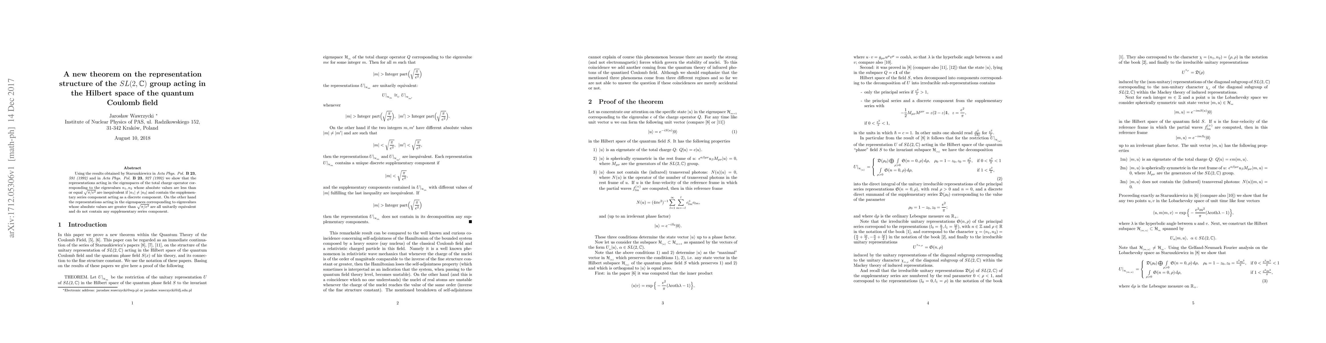 Using the results obtained by Staruszkiewicz in Acta Phys. Pol. B 23, 591 (1992) and in Acta Phys. Pol. B 23, 927 (1992) we show that the representations acting in the eigenspaces of the total charge operator corresponding to the eigenvalues $n_1, n_2$ whose absolute values are less than or equal $\sqrt{\pi/e^2}$ are inequivalent if $|n_1| \neq |n_2|$ and contain the supplementary series component acting as a discrete component. On the other hand the representations acting in the eigenspaces corresponding to eigenvalues whose absolute values are greater than $\sqrt{\pi/e^2}$ are all unitarily equivalent and do not contain any supplementary series component.