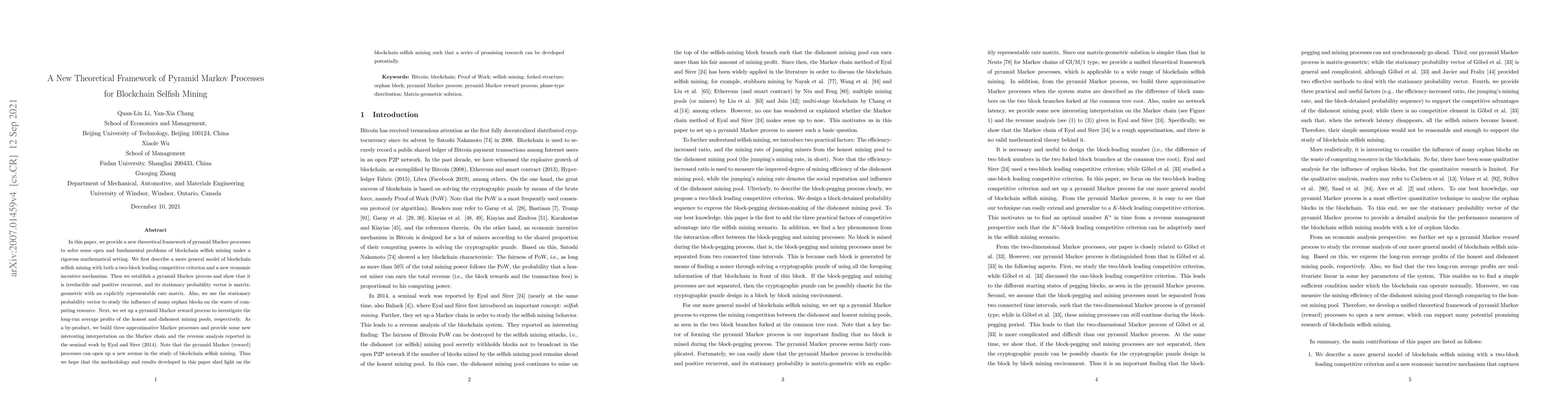A new framework for blockchain selfish mining uses pyramid Markov processes to study waste of computing resources and long-run profits of honest and dishonest mining pools.