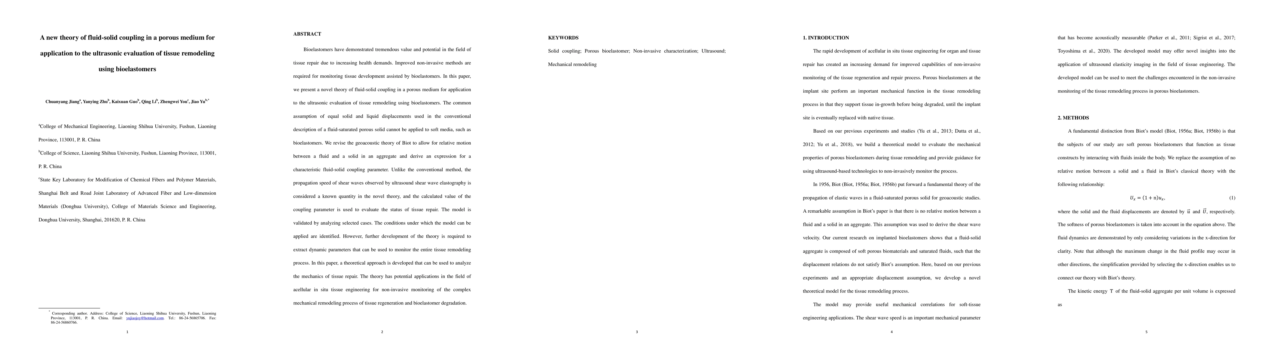 This paper introduces a novel theory of fluid-solid coupling in porous media tailored for ultrasonic evaluation of tissue remodeling using bioelastomers. The revised theory accounts for relative motion between fluid and solid phases, providing a new parameter to assess tissue repair status and potential applications in non-invasive monitoring of tissue regeneration and bioelastomer degradation.
