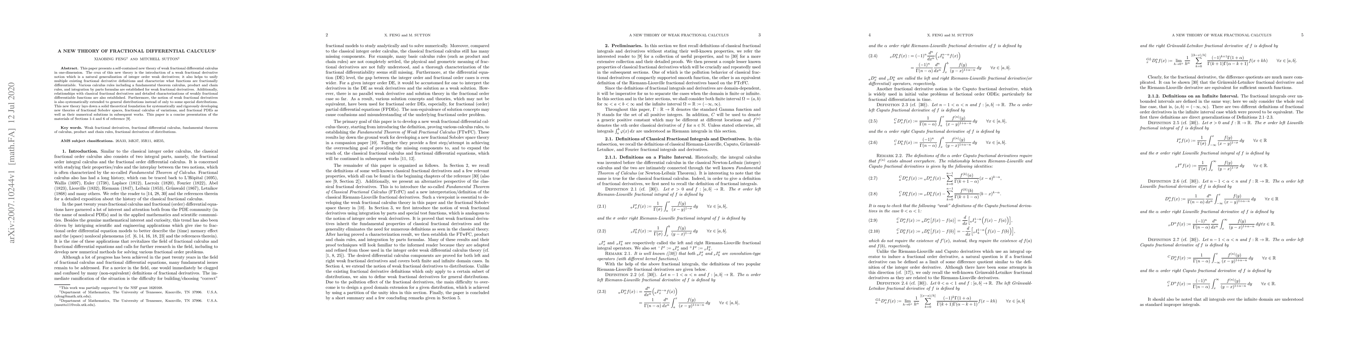 This paper presents a self-contained new theory of weak fractional differential calculus in one-dimension. The crux of this new theory is the introduction of a weak fractional derivative notion which is a natural generalization of integer order weak derivatives; it also helps to unify multiple existing fractional derivative definitions and characterize what functions are fractionally differentiable. Various calculus rules including a fundamental theorem calculus, product and chain rules, and integration by parts formulas are established for weak fractional derivatives. Additionally, relationships with classical fractional derivatives and detailed characterizations of weakly fractional differentiable functions are also established. Furthermore, the notion of weak fractional derivatives is also systematically extended to general distributions instead of only to some special distributions. This new theory lays down a solid theoretical foundation for systematically and rigorously developing new theories of fractional Sobolev spaces, fractional calculus of variations, and fractional PDEs as well as their numerical solutions in subsequent works. This paper is a concise presentation of the materials of Sections 1-4 and 6 of reference [9].