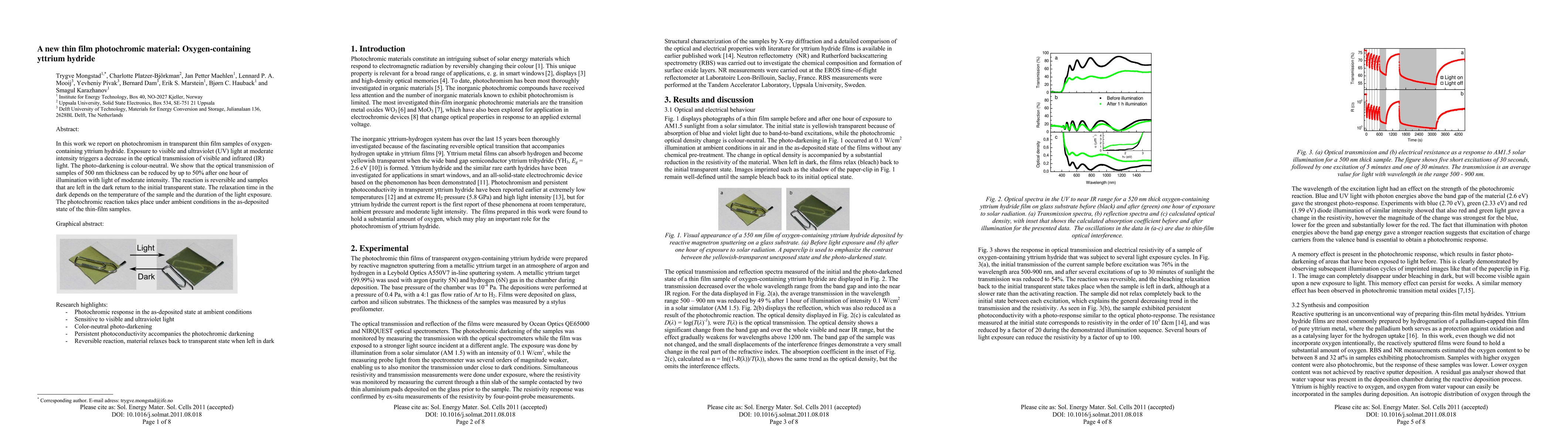 In this work we report on photochromism in transparent thin film samples of oxygen-containing yttrium hydride. Exposure to visible and ultraviolet (UV) light at moderate intensity triggers a decrease in the optical transmission of visible and infrared (IR) light. The photo-darkening is colour-neutral. We show that the optical transmission of samples of 500 nm thickness can be reduced by up to 50% after one hour of illumination with light of moderate intensity. The reaction is reversible and samples that are left in the dark return to the initial transparent state. The relaxation time in the dark depends on the temperature of the sample and the duration of the light exposure. The photochromic reaction takes place under ambient conditions in the as-deposited state of the thin-film samples.