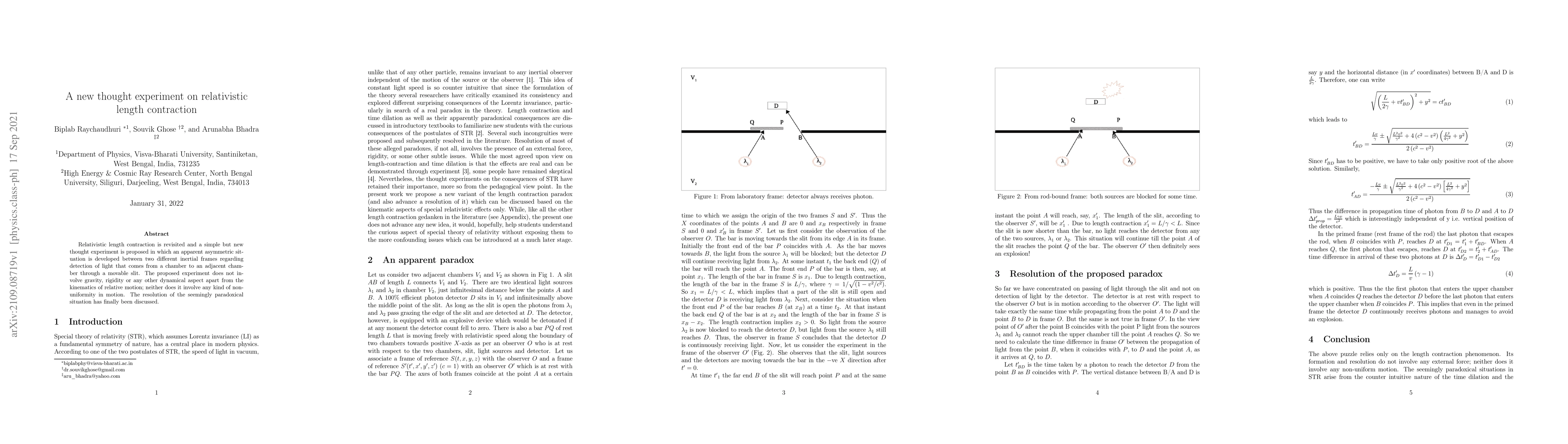 Relativistic length contraction is revisited and a simple but new thought experiment is proposed in which an apparent asymmetric situation is developed between two different inertial frames regarding detection of light that comes from a chamber to an adjacent chamber through a movable slit. The proposed experiment does not involve gravity, rigidity or any other dynamical aspect apart from the kinematics of relative motion; neither does it involve any kind of non-uniformity in motion. The resolution of the seemingly paradoxical situation has finally been discussed.