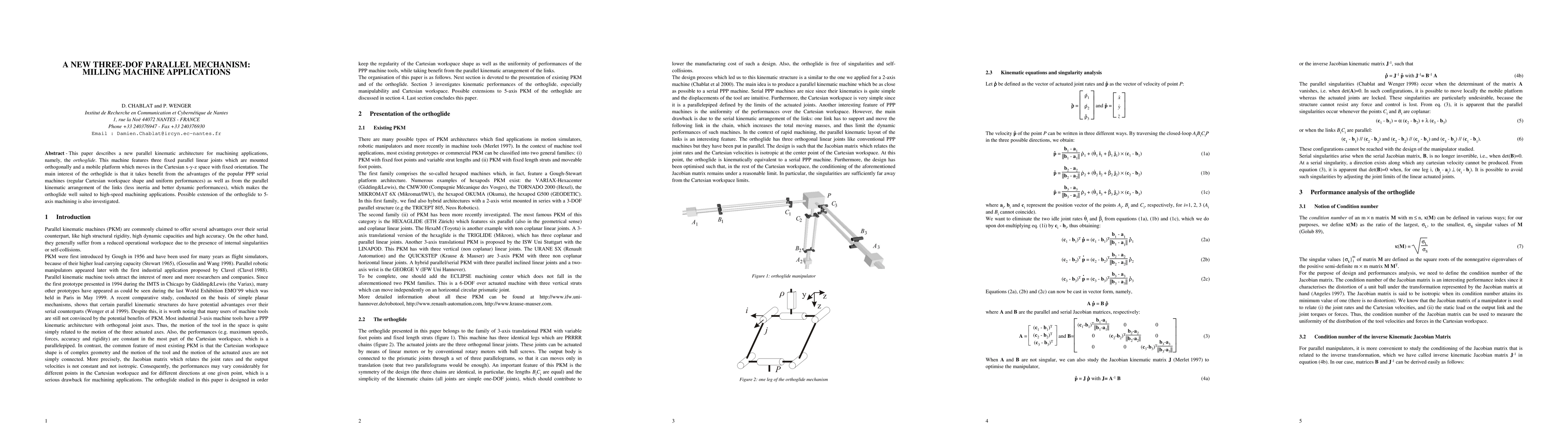 This paper introduces the orthoglide, a novel three-DOF parallel mechanism for high-speed milling applications, combining the benefits of serial and parallel kinematics for efficient machining. The potential for extending this design to 5-axis capabilities is also explored.