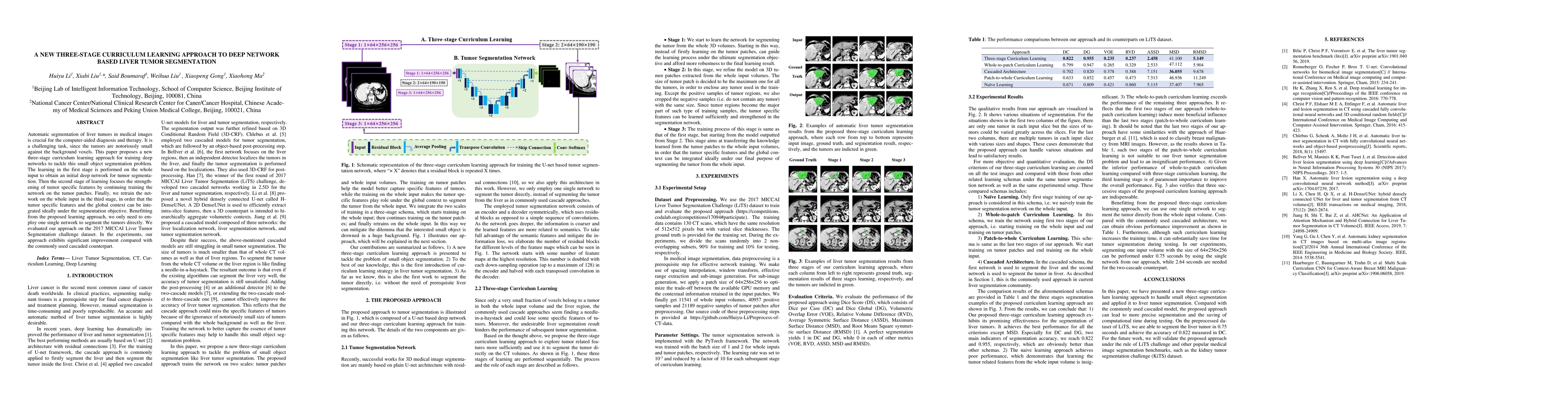 This paper introduces a three-stage curriculum learning approach for training deep networks to segment liver tumors in medical images, focusing on small object detection. The method sequentially trains the network on whole images, tumor patches, and then retrains on whole images to integrate local and global features, achieving superior results compared to cascaded methods on the 2017 MICCAI Liver Tumor Segmentation challenge dataset.