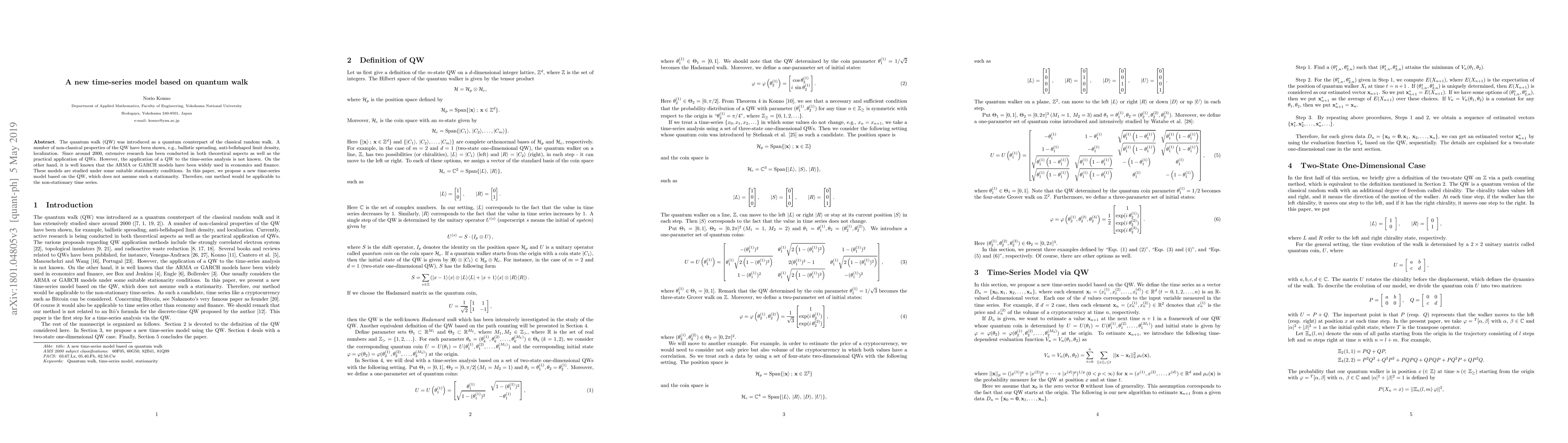 The quantum walk (QW) was introduced as a quantum counterpart of the classical random walk. A number of non-classical properties of the QW have been shown, e.g., ballistic spreading, anti-bellshaped limit density, localization. Since around 2000, extensive research has been conducted in both theoretical aspects as well as the practical application of QWs. However, the application of a QW to the time-series analysis is not known. On the other hand, it is well known that the ARMA or GARCH models have been widely used in economics and finance. These models are studied under some suitable stationarity conditions. In this paper, we propose a new time-series model based on the QW, which does not assume such a stationarity. Therefore, our method would be applicable to the non-stationary time series.