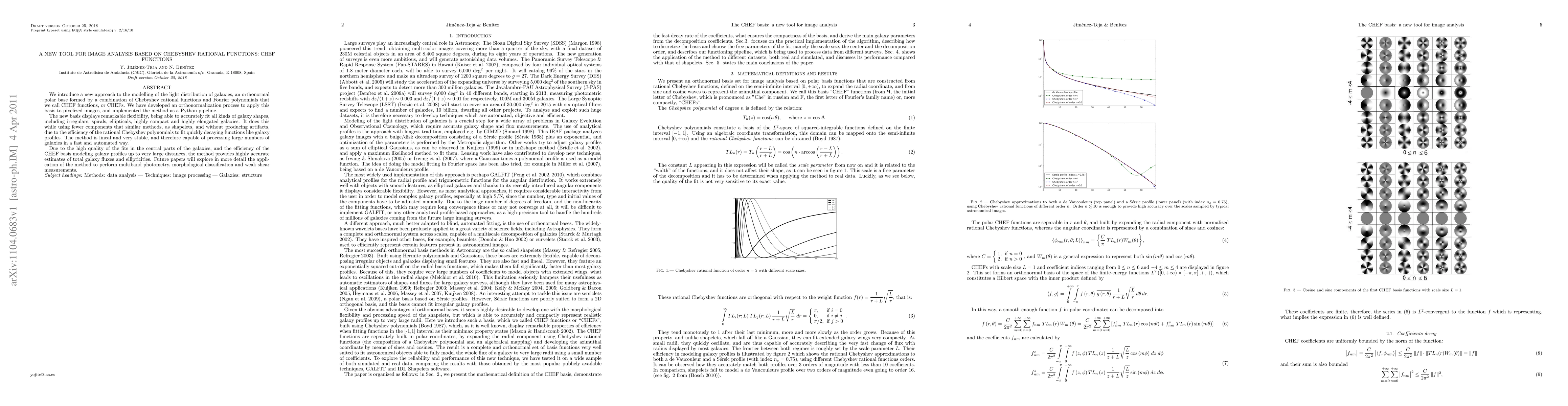 We introduce a new approach to the modelling of the light distribution of galaxies, an orthonormal polar base formed by a combination of Chebyshev rational functions and Fourier polynomials that we call CHEF functions, or CHEFs. We have developed an orthonormalization process to apply this basis to pixelized images, and implemented the method as a Python pipeline. The new basis displays remarkable flexibility, being able to accurately fit all kinds of galaxy shapes, including irregulars, spirals, ellipticals, highly compact and highly elongated galaxies. It does this while using fewer components that similar methods, as shapelets, and without producing artifacts, due to the efficiency of the rational Chebyshev polynomials to fit quickly decaying functions like galaxy profiles. The method is lineal and very stable, and therefore capable of processing large numbers of galaxies in a fast and automated way. Due to the high quality of the fits in the central parts of the galaxies, and the efficiency of the CHEF basis modeling galaxy profiles up to very large distances, the method provides highly accurate estimates of total galaxy fluxes and ellipticities. Future papers will explore in more detail the application of the method to perform multiband photometry, morphological classification and weak shear measurements.