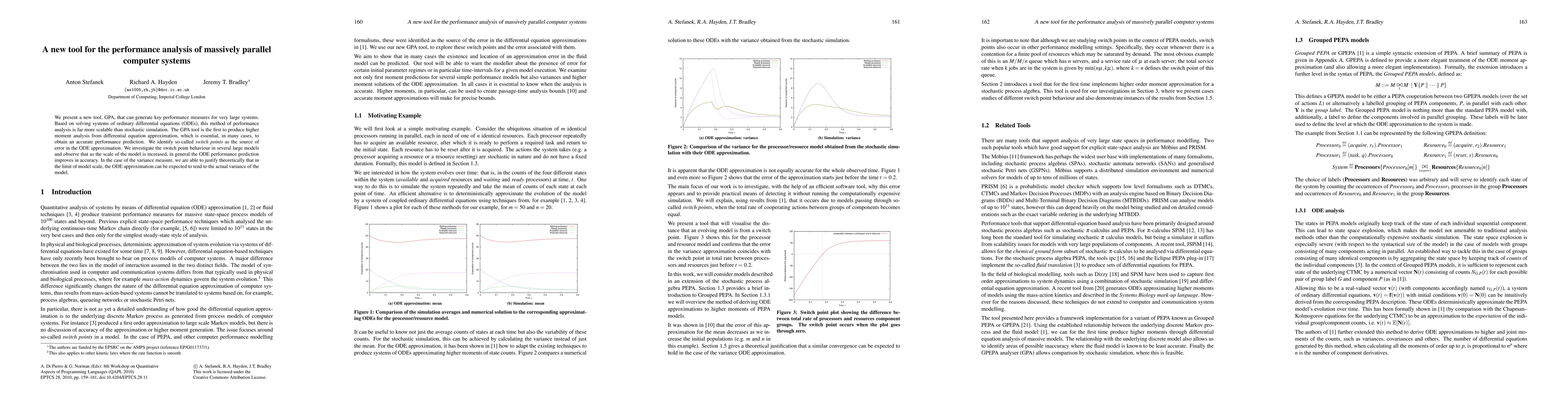 We present a new tool, GPA, that can generate key performance measures for very large systems. Based on solving systems of ordinary differential equations (ODEs), this method of performance analysis is far more scalable than stochastic simulation. The GPA tool is the first to produce higher moment analysis from differential equation approximation, which is essential, in many cases, to obtain an accurate performance prediction. We identify so-called switch points as the source of error in the ODE approximation. We investigate the switch point behaviour in several large models and observe that as the scale of the model is increased, in general the ODE performance prediction improves in accuracy. In the case of the variance measure, we are able to justify theoretically that in the limit of model scale, the ODE approximation can be expected to tend to the actual variance of the model.