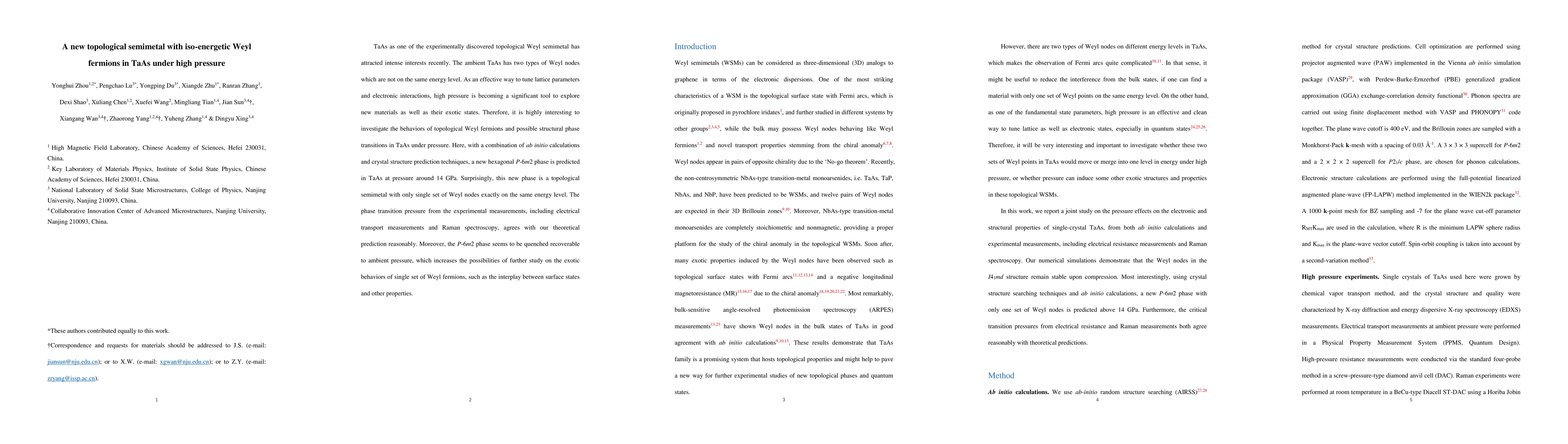 The paper predicts a new hexagonal P-6m2 phase of TaAs at around 14 GPa under high pressure, which exhibits a unique topological semimetal state with iso-energetic Weyl fermions. Experimental measurements confirm the theoretical prediction of phase transition and suggest the phase's quenched recoverability to ambient pressure.