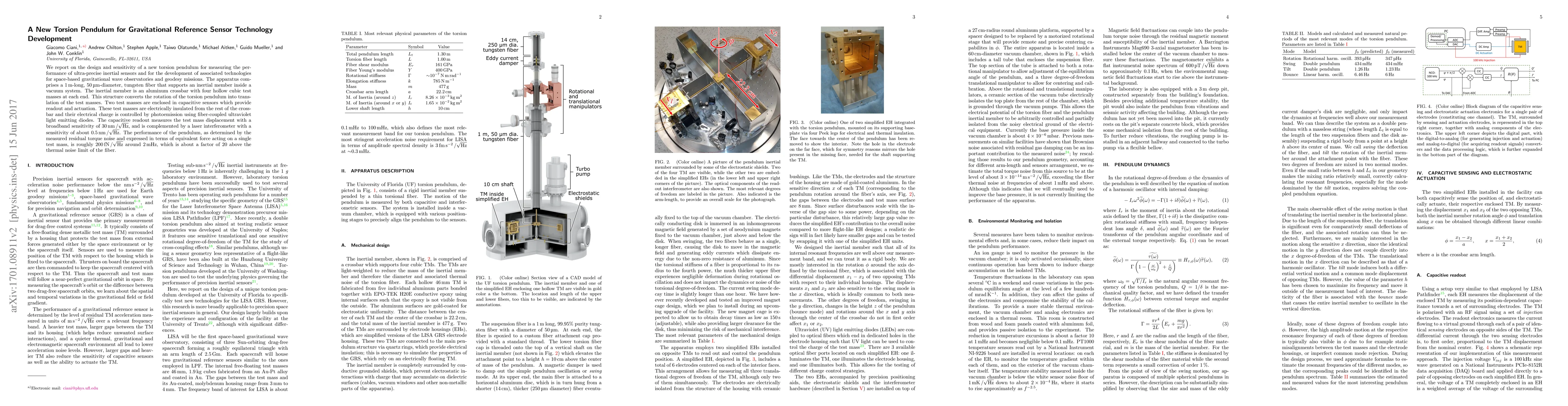 This paper details the design and high sensitivity of a new torsion pendulum for ultra-precise inertial sensors, featuring a tungsten fiber and capacitive sensors for measuring gravitational wave observatories and geodesy missions. The setup achieves a broadband sensitivity of 30 nm/sqrt(Hz) and residual torque noise of 200 fN/sqrt(Hz) around 2 mHz.