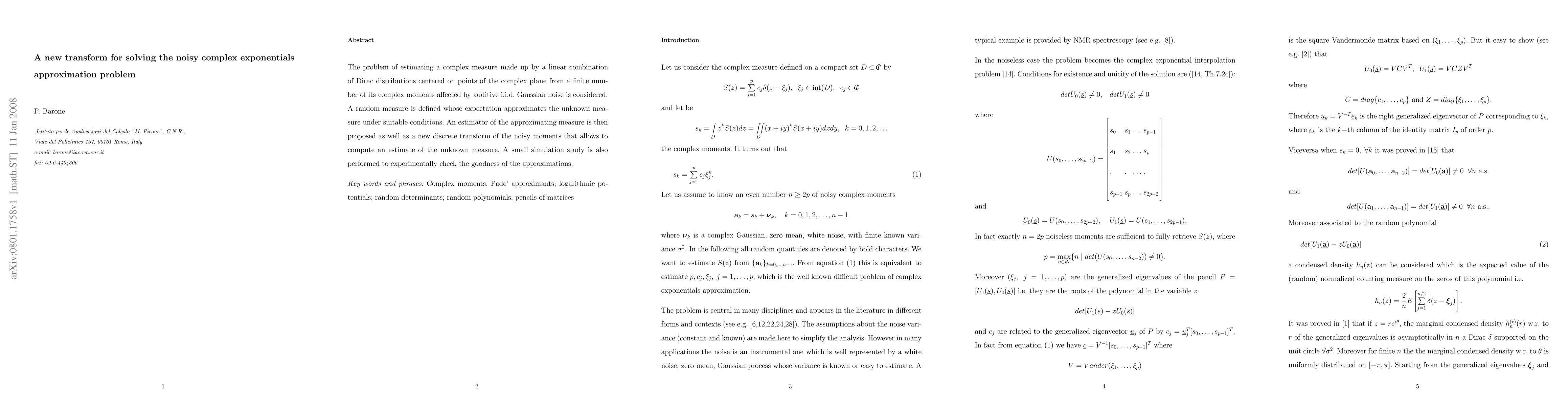 This paper proposes a new discrete transform for estimating a complex measure composed of Dirac distributions from noisy complex moments, introducing an estimator and conducting a simulation study to validate its effectiveness. The transform is designed to approximate the unknown measure under specific conditions.