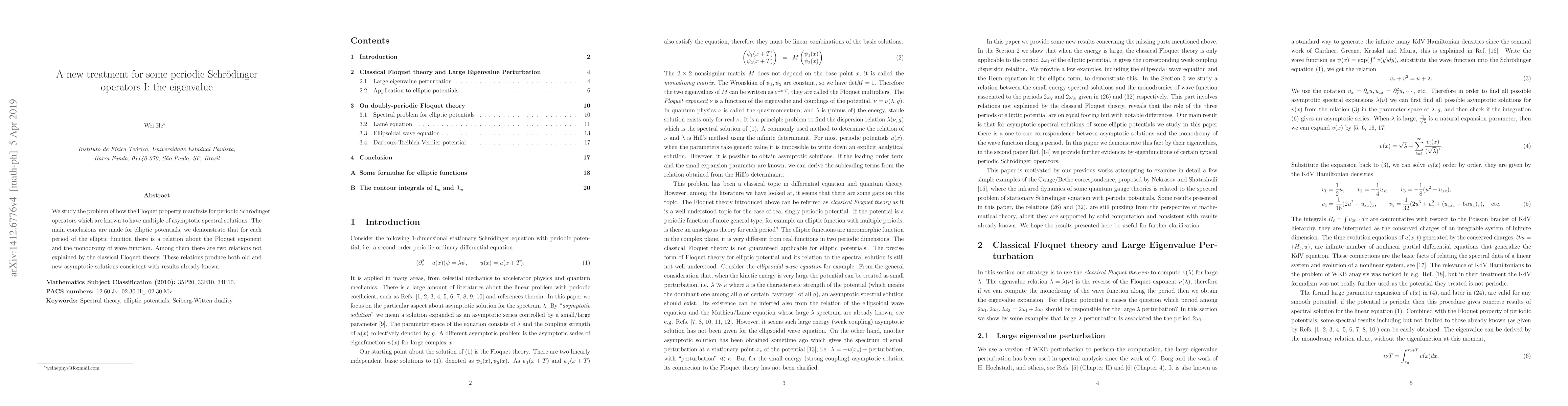 This paper investigates the Floquet property in periodic Schrödinger operators with multiple asymptotic spectral solutions, particularly for elliptic potentials. It reveals new relations between the Floquet exponent and the monodromy of wave functions, producing both known and novel asymptotic solutions.