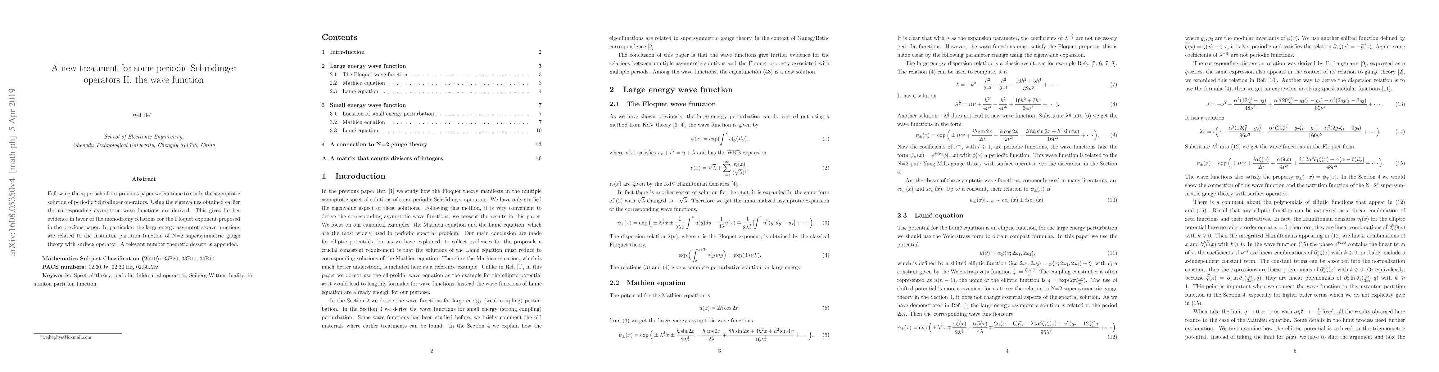 Following the approach of our previous paper we continue to study the asymptotic solution of periodic Schr\"{o}dinger operators. Using the eigenvalues obtained earlier the corresponding asymptotic wave functions are derived. This gives further evidence in favor of the monodromy relations for the Floquet exponent proposed in the previous paper. In particular, the large energy asymptotic wave functions are related to the instanton partition function of N=2 supersymmetric gauge theory with surface operator. A relevant number theoretic dessert is appended.