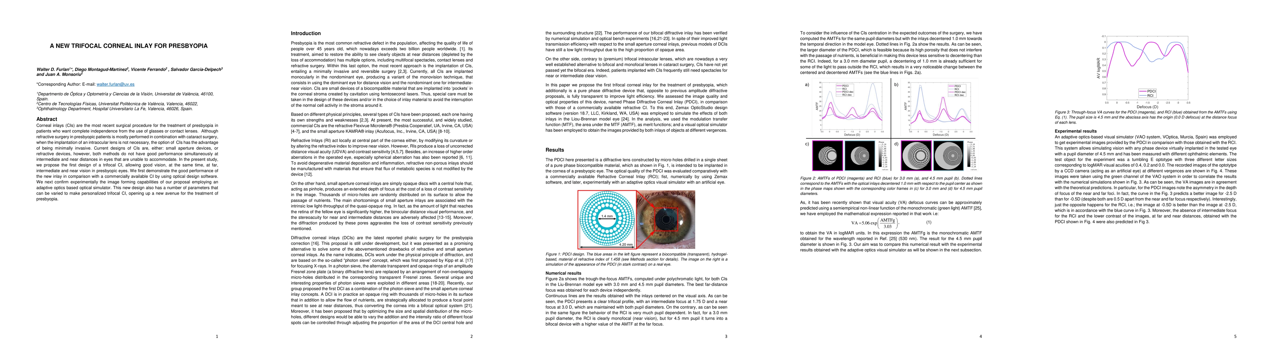 This paper introduces a novel trifocal corneal inlay designed to treat presbyopia, offering improved vision at far, intermediate, and near distances. The study demonstrates the inlay's superior performance over existing designs using optical simulation and experimental validation with an adaptive optics system.