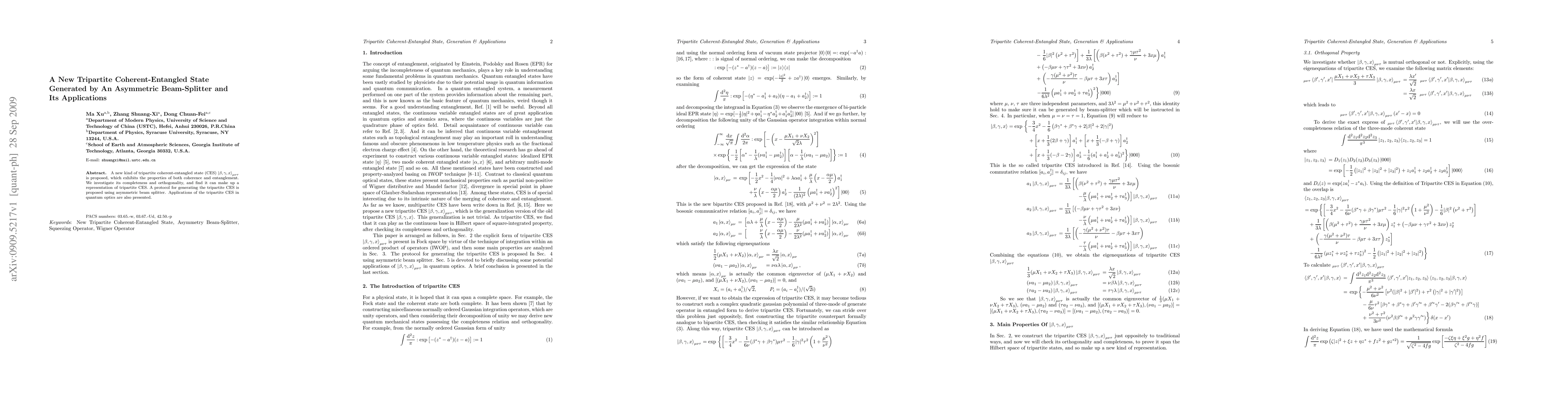 This paper proposes a new tripartite coherent-entangled state generated via an asymmetric beam splitter, demonstrating its completeness and orthogonality. Potential applications in quantum optics are explored.