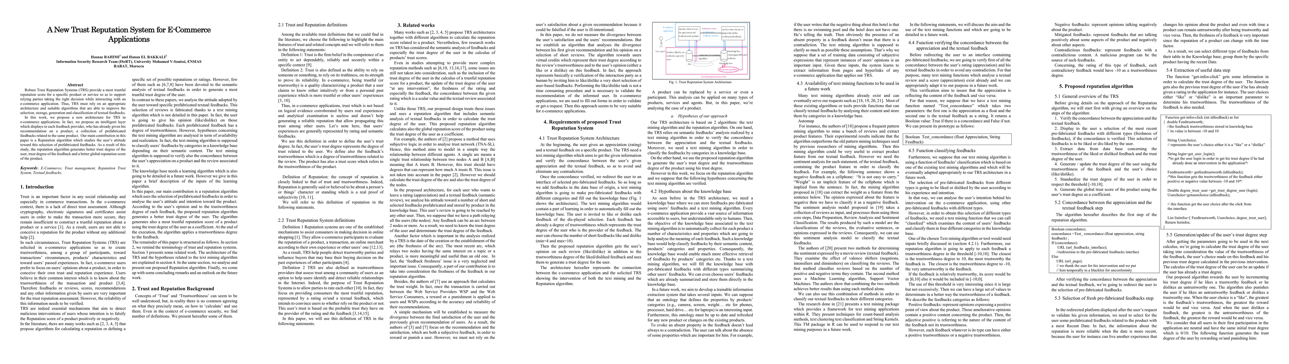 Robust Trust Reputation Systems (TRS) provide a most trustful reputation score for a specific product or service so as to support relying parties taking the right decision while interacting with an e-commerce application. Thus, TRS must rely on an appropriate architecture and suitable algorithms that are able to improve the selection, storage, generation and classification of textual feedbacks. In this work, we propose a new architecture for TRS in e-commerce applications. In fact, we propose an intelligent layer which displays to each feedback provider, who has already given his recommendation on a product, a collection of prefabricated feedbacks related to the same product. The proposed reputation algorithm generates better trust degree of the user, trust degree of the feedback and a better global reputation score of the product.