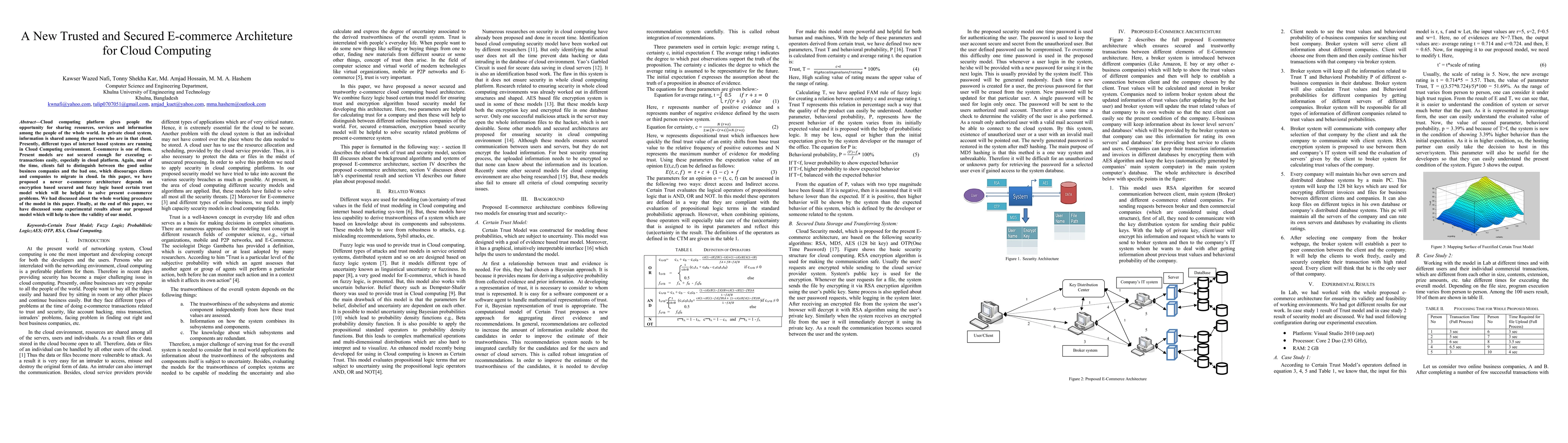 This paper proposes a new e-commerce architecture for cloud computing that utilizes encryption and a fuzzy logic-based trust model to enhance security and distinguish trustworthy online businesses, aiming to address current e-commerce challenges in cloud platforms. Experimental results demonstrate the effectiveness of the proposed model.