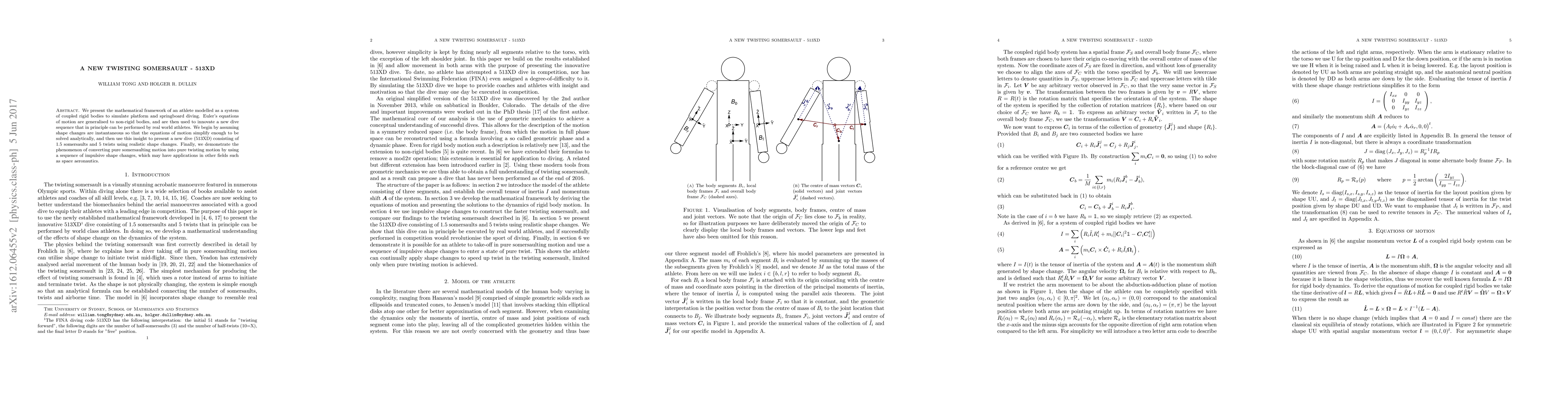Researchers developed a mathematical framework to simulate platform and springboard diving using coupled rigid bodies and generalized Euler's equations of motion. They proposed a new dive sequence, 513XD, consisting of 1.5 somersaults and 5 twists with realistic shape changes.