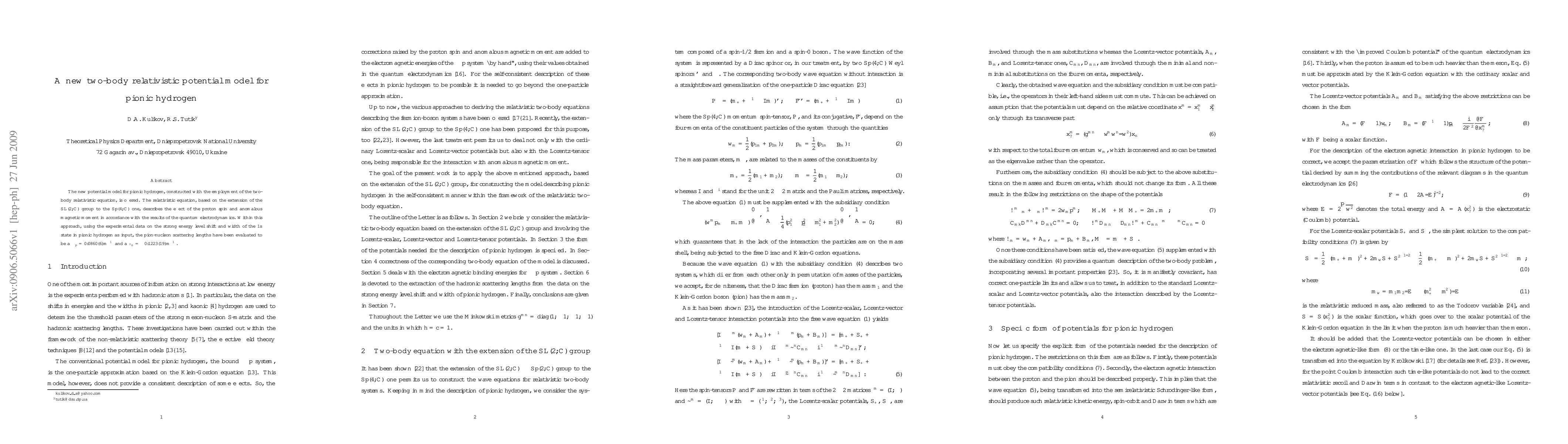 The new potential model for pionic hydrogen, constructed with the employment of the two-body relativistic equation, is offered. The relativistic equation, based on the extension of the $SL(2,C)$ group to the $Sp(4,C)$ one, describes the effect of the proton spin and anomalous magnetic moment in accordance with the results of the quantum electrodynamics. Within this approach, using the experimental data on the strong energy level shift and width of the $1s$ state in pionic hydrogen as input, the pion-nucleon scattering lengths have been evaluated to be $a_{\pi^{-}p}=0.0860(6)m_{\pi}^{-1}$ and $a_{\pi^{0}n}=-0.1223(19)m_{\pi}^{-1}$.