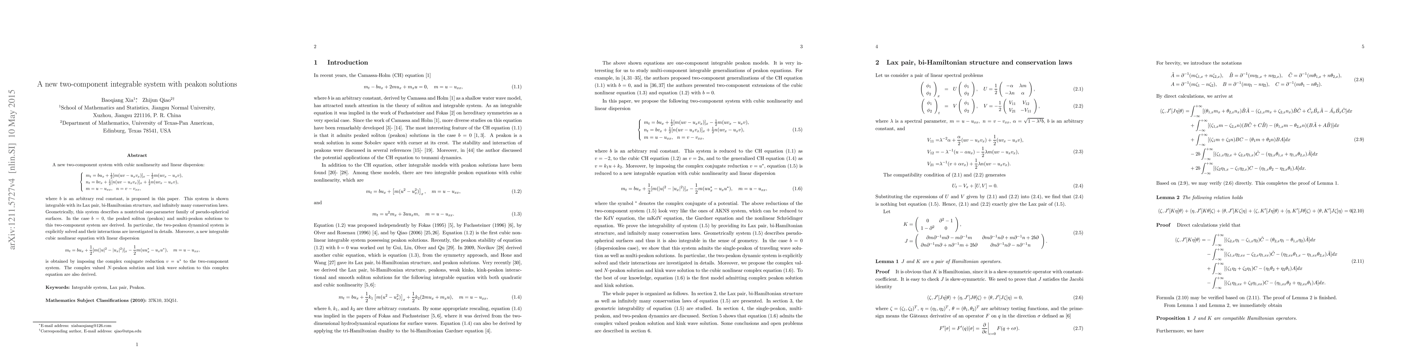 This paper introduces a new two-component integrable system with cubic nonlinearity and linear dispersion, demonstrating its integrability through a Lax pair, bi-Hamiltonian structure, and conservation laws. It derives peakon and multi-peakon solutions, particularly solving the two-peakon dynamics and investigating their interactions.