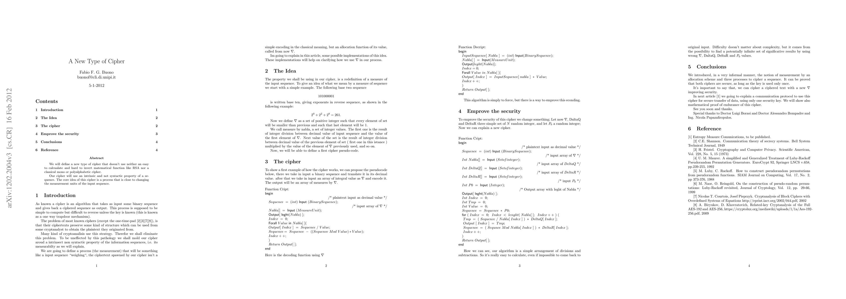 We will define a new type of cipher that doesn't use neither an easy to calcualate and hard to invert matematical function like RSA nor a classical mono or polyalphabetic cipher.