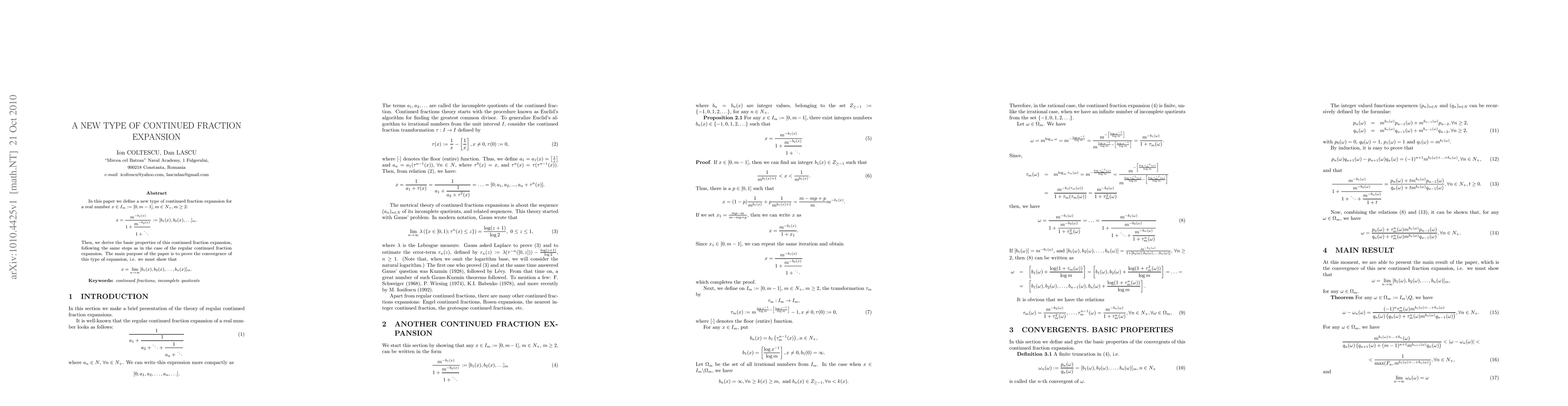 In this paper we define a new type of continued fraction expansion for a real number $x \in I_m:=[0,m-1], m\in N_+, m\geq 2$: \[x = \frac{m^{-b_1(x)}}{\displaystyle 1+\frac{m^{-b_2(x)}}{1+\ddots}}:=[b_1(x), b_2(x), ...]_m. \] Then, we derive the basic properties of this continued fraction expansion, following the same steps as in the case of the regular continued fraction expansion. The main purpose of the paper is to prove the convergence of this type of expansion, i.e. we must show that \[x= \lim_{n\rightarrow\infty}[b_1(x), b_2(x), ..., b_n(x)]_m. \]