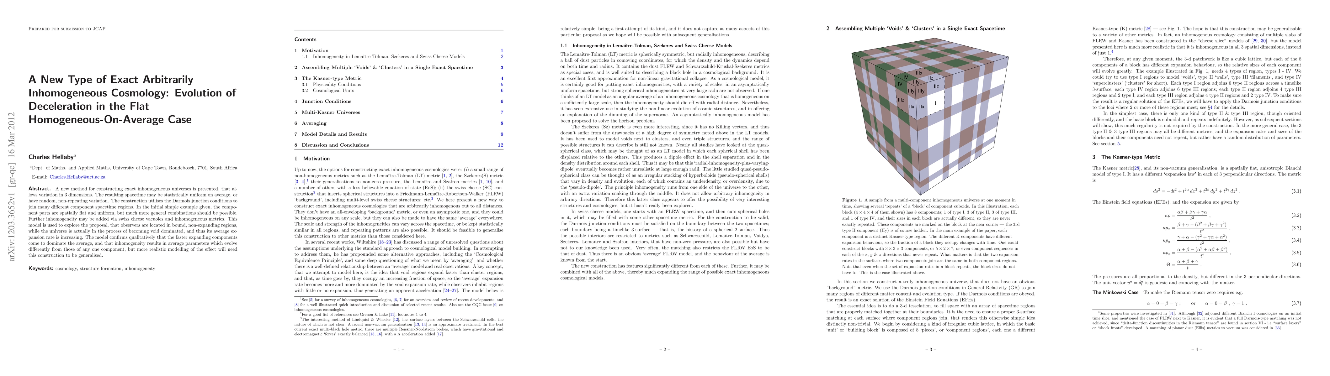 A new method for constructing exact inhomogeneous universes is presented, that allows variation in 3 dimensions. The resulting spacetime may be statistically uniform on average, or have random, non-repeating variation. The construction utilises the Darmois junction conditions to join many different component spacetime regions. In the initial simple example given, the component parts are spatially flat and uniform, but much more general combinations should be possible. Further inhomogeneity may be added via swiss cheese vacuoles and inhomogeneous metrics. This model is used to explore the proposal, that observers are located in bound, non-expanding regions, while the universe is actually in the process of becoming void dominated, and thus its average expansion rate is increasing. The model confirms qualitatively that the faster expanding components come to dominate the average, and that inhomogeneity results in average parameters which evolve differently from those of any one component, but more realistic modelling of the effect will need this construction to be generalised.