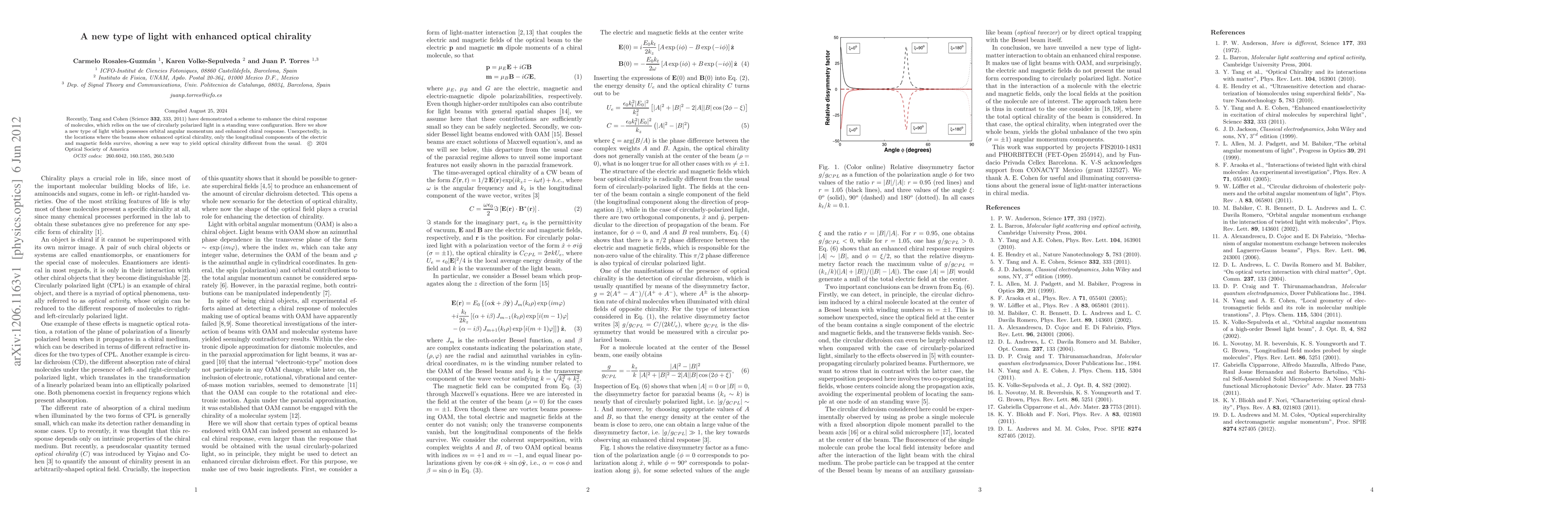 Recently, Tang and Cohen (Science 332, 333, 2011) have demonstrated a scheme to enhance the chiral response of molecules, which relies on the use of circularly polarized light in a standing wave configuration. Here we show a new type of light which possesses orbital angular momentum and enhanced chiral response. Unexpectedly, in the locations where the beams show enhanced optical chirality, only the longitudinal components of the electric and magnetic fields survive, showing a new way to yield optical chirality different from the usual.