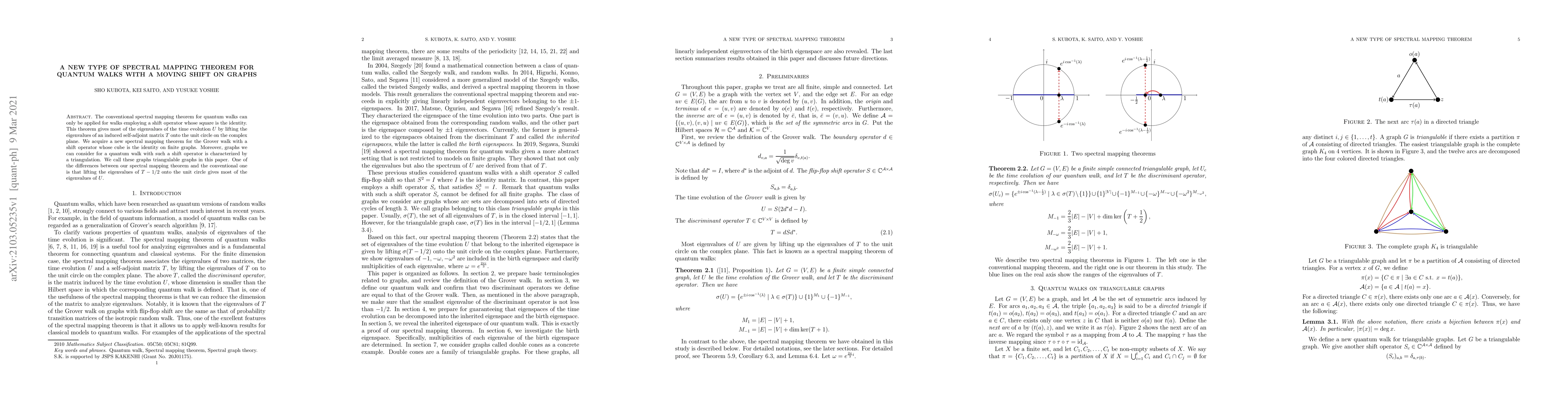 Title: A new type of spectral mapping theorem for quantum walks with a moving shift on graphs Summary: This paper introduces a novel spectral mapping theorem for quantum walks using a shift operator whose cube is the identity, applicable to triangulable graphs, differing from the conventional theorem by mapping eigenvalues of $T-1/2$ onto the unit circle.
