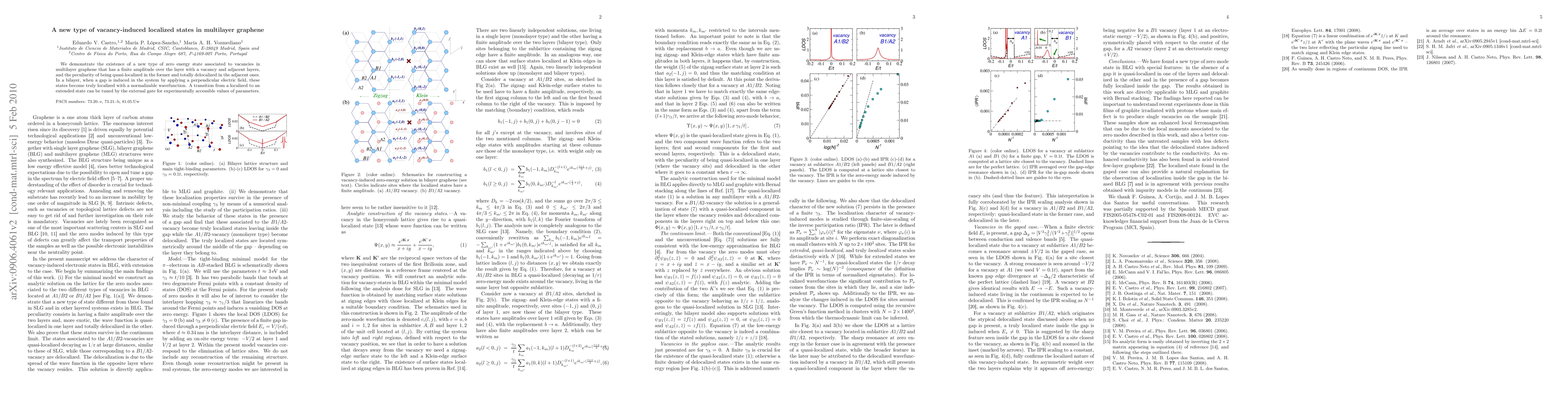 Summary: This paper reveals a novel zero energy state in multilayer graphene induced by vacancies, which is quasi-localized near the vacancy and delocalized in adjacent layers. Under a perpendicular electric field, these states can become fully localized, with the transition tunable via an external gate.
