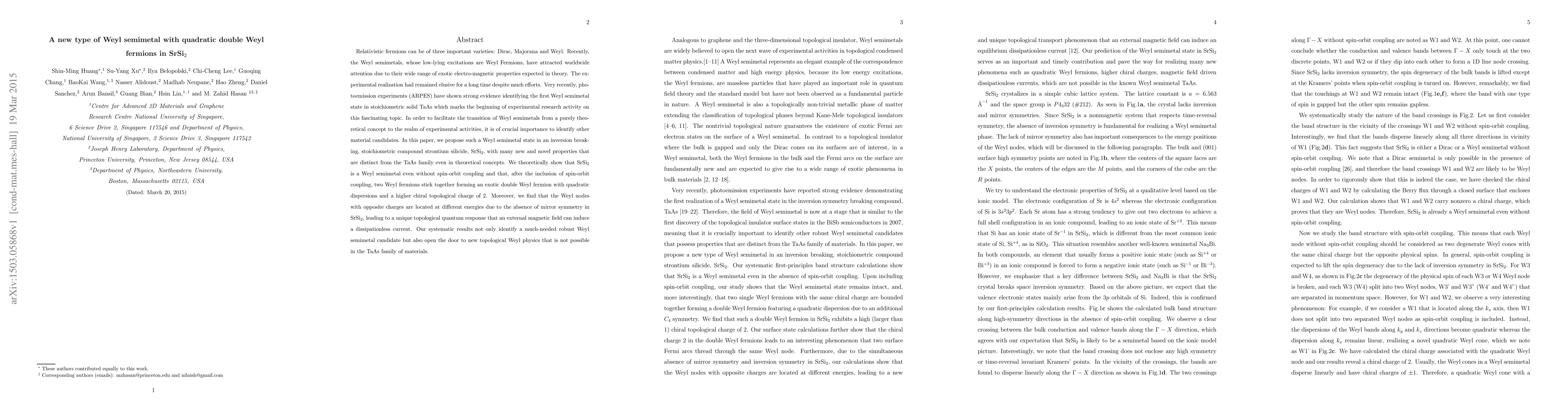 SrSi$_2$ is identified as a novel Weyl semimetal featuring quadratic double Weyl fermions with a unique topological response, including dissipationless currents under magnetic fields, setting it apart from the TaAs family of materials. The absence of mirror symmetry allows for Weyl nodes at different energies, offering new possibilities in topological physics.