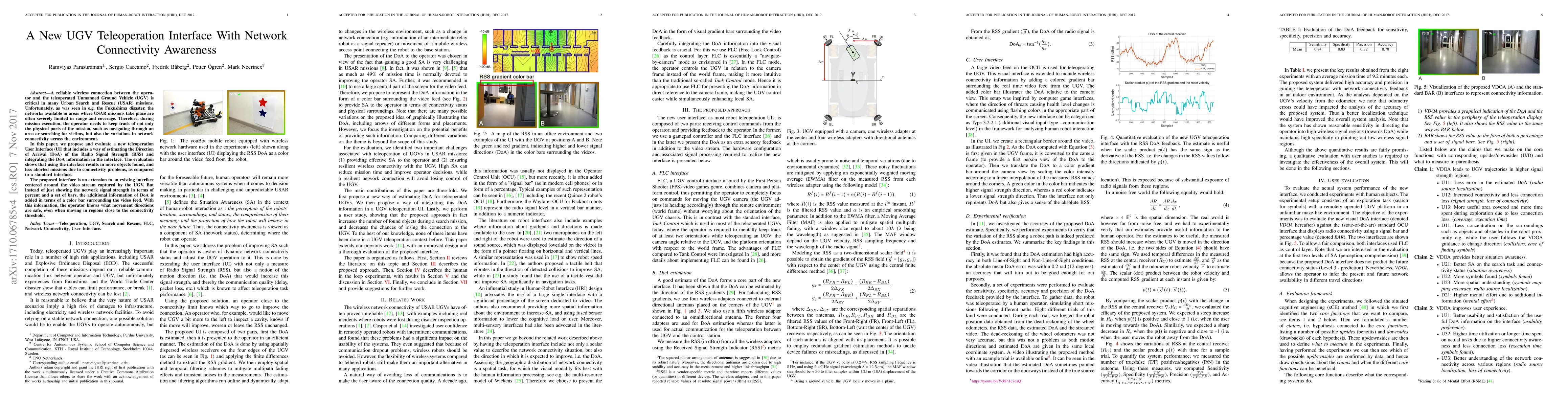 This paper proposes a new teleoperation interface for UGVs that enhances the operator's awareness of network connectivity and physical surroundings, using Direction of Arrival (DoA) of Radio Signal Strength (RSS) to guide safe navigation. Evaluations show improved mission success and reduced connectivity-related failures compared to standard interfaces.